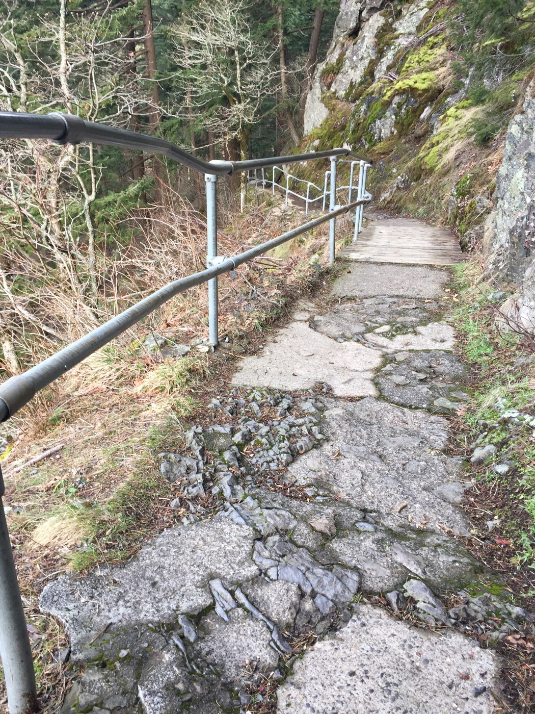 We were on our way to stay in Oregon and we came across Beacon Rock. It was so beautiful and we saw it was a hike so we stopped. There were signs up saying closed due to snow in Jan, but we started up anyways. There was no snow on the trail, but it was VERY cold. There were some big trees down over the trail in the start but we crawled over/under them and got over them ok. Once we got to the bridging, the gate was locked and we could not go any further. It looked like they might have some repairs/cleaning to do from snowfall over the winter because the hand rails were bent a little.