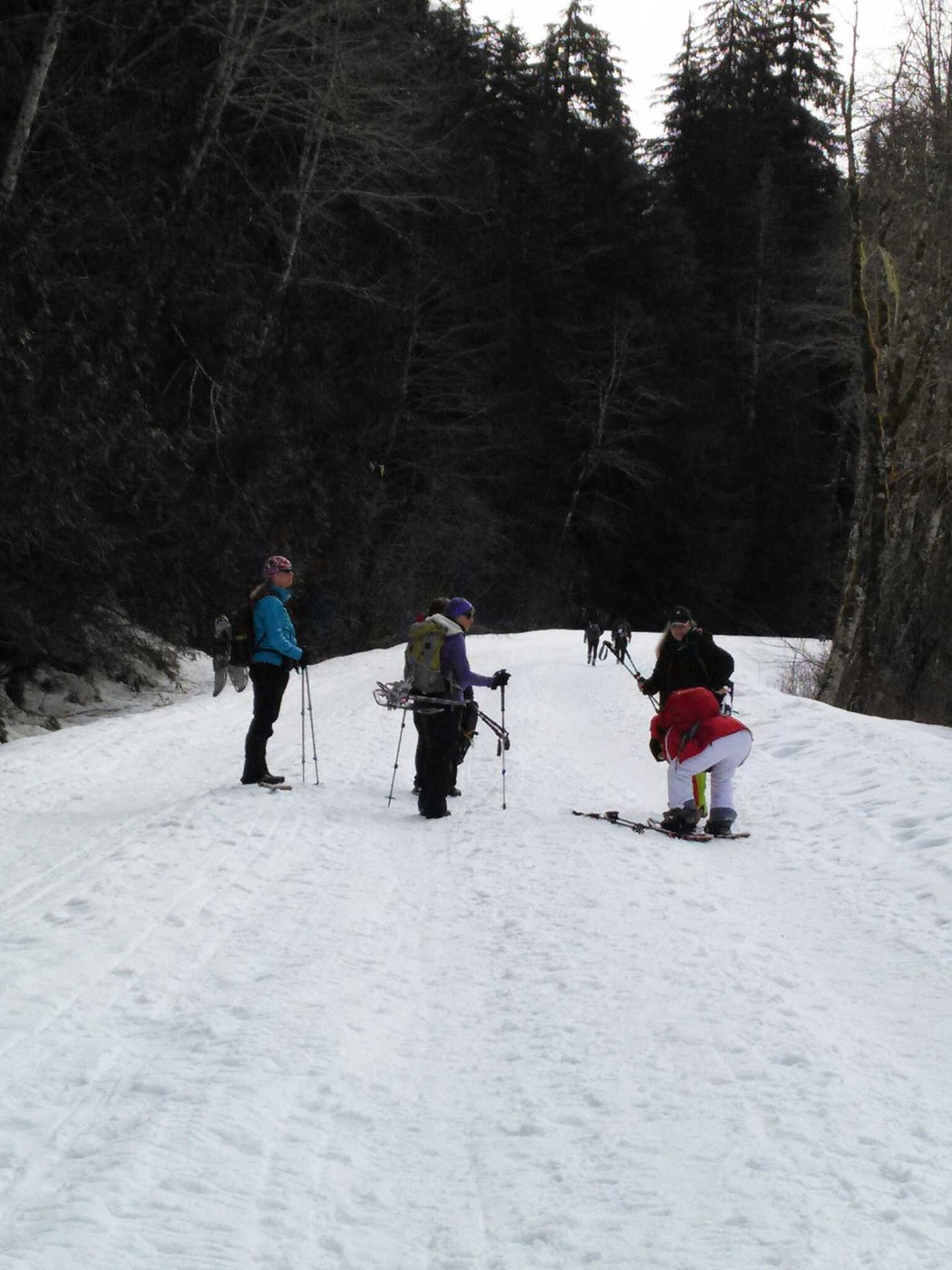 Went with a group of 16 adults with varying degrees of snowshoe skills. the snow was pretty compacted along the entire length of the trail. Some opted to use their snowshoes, some opted to use microspikes or Yak Tracks, some opted for bare boots. Everyone had a nice hike without injury. Note that you have to park at the closed gate, so this route is 7.0 miles RT for snowshoe with 4 miles RT on the closed Mountain Loop Road.