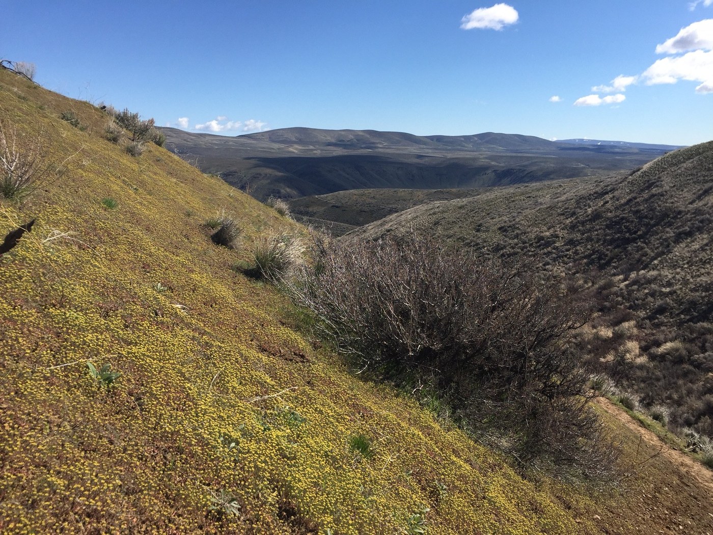 A great day for the east side! We arrived to a nearly empty parking lot around 10am, and hiked the ridge trail. A few flowers are starting to come out and the grass is getting greener. Except for a strong and gusty wind, it was a perfect day. After topping out on the ridge, we hiked the dirt road to the next knoll about a mile further along then headed back down to the intersection by the parking lot.