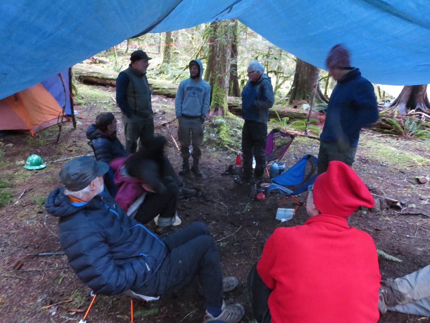 Day 1: Arrived at Duckabush trailhead. Leader Ken gave the safety briefing. It started to rain. It rained as we hiked in over Little Hump to River Camp. Set up camp in the rain. Headed up Big Hump and started sawing. Rain stopped, sun came out, cleared LOTS of logs. One team did a great job clearing a rockslide from a section of trail. Rain started again soon after dark.