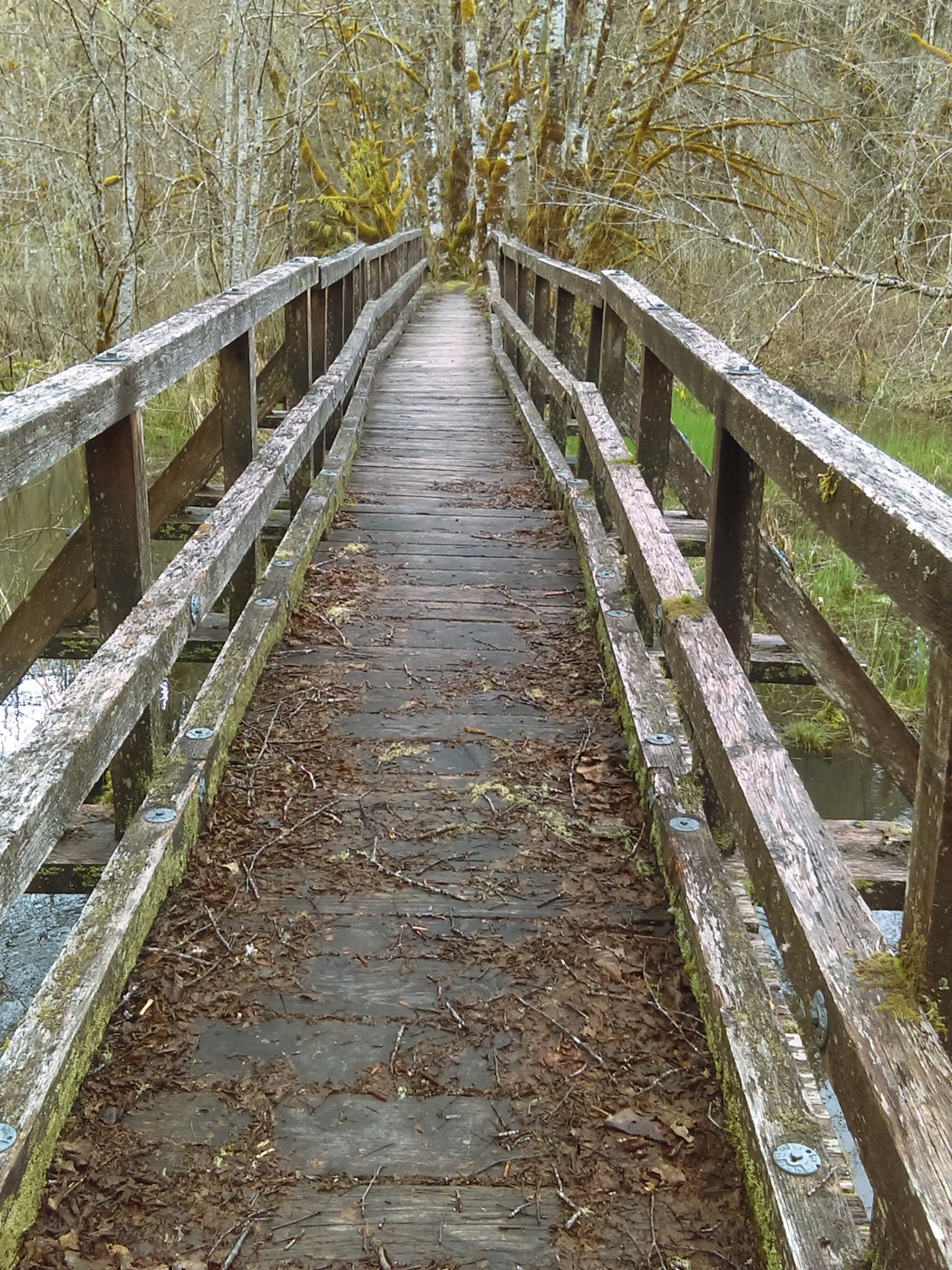 Trillium, woods violets,blooming salmon berry stalks, ferns, fiddle heads, and skunk cabbage are noticeable along the sides of the trail.