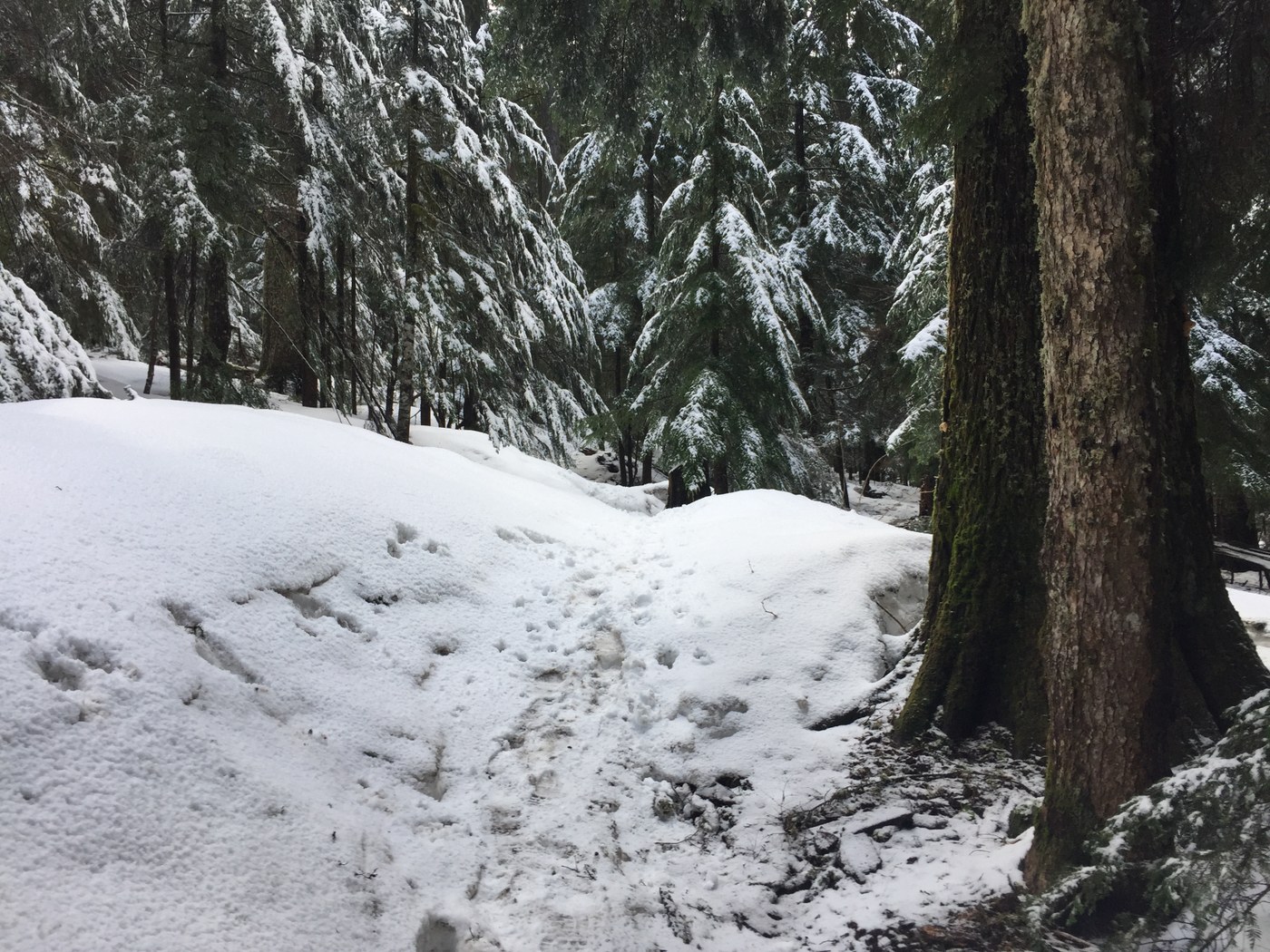 At 1 1/2 miles from the point the trail was completely covered by snow. Again, I didn't ever feel concerned about my footing.