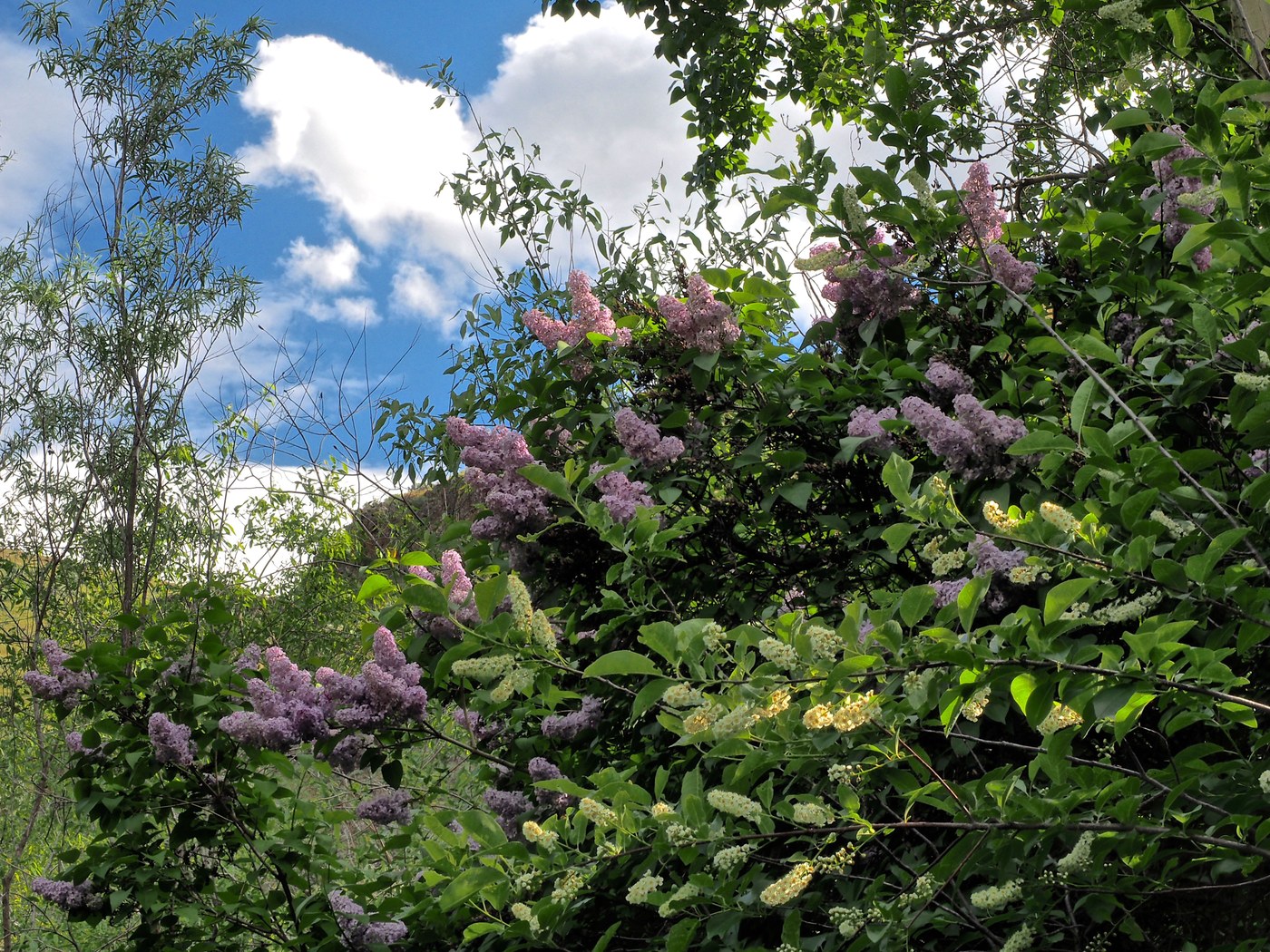 After setting up camp at Big Pines CG, we drove to the Umtanum Recreation Area and hiked two miles to the second creek crossing. This crossing was doable across logs, but it was our turn around time. At the first creek crossing we had to wait for a rattlesnake to cross the logs! Something you don't see every day! :)! White and lavender lilacs and quince were seen at the old homestead. Lupine, balsamroot, popcorn flowers, fiddle neck, Iris, bitterbrush, larkspur, phacelia, and puccoon were some of the other flowers seen. We had read that Lazuli Bunting and Yellow-breasted chats were in the area, but we saw none. We saw only a harrier.