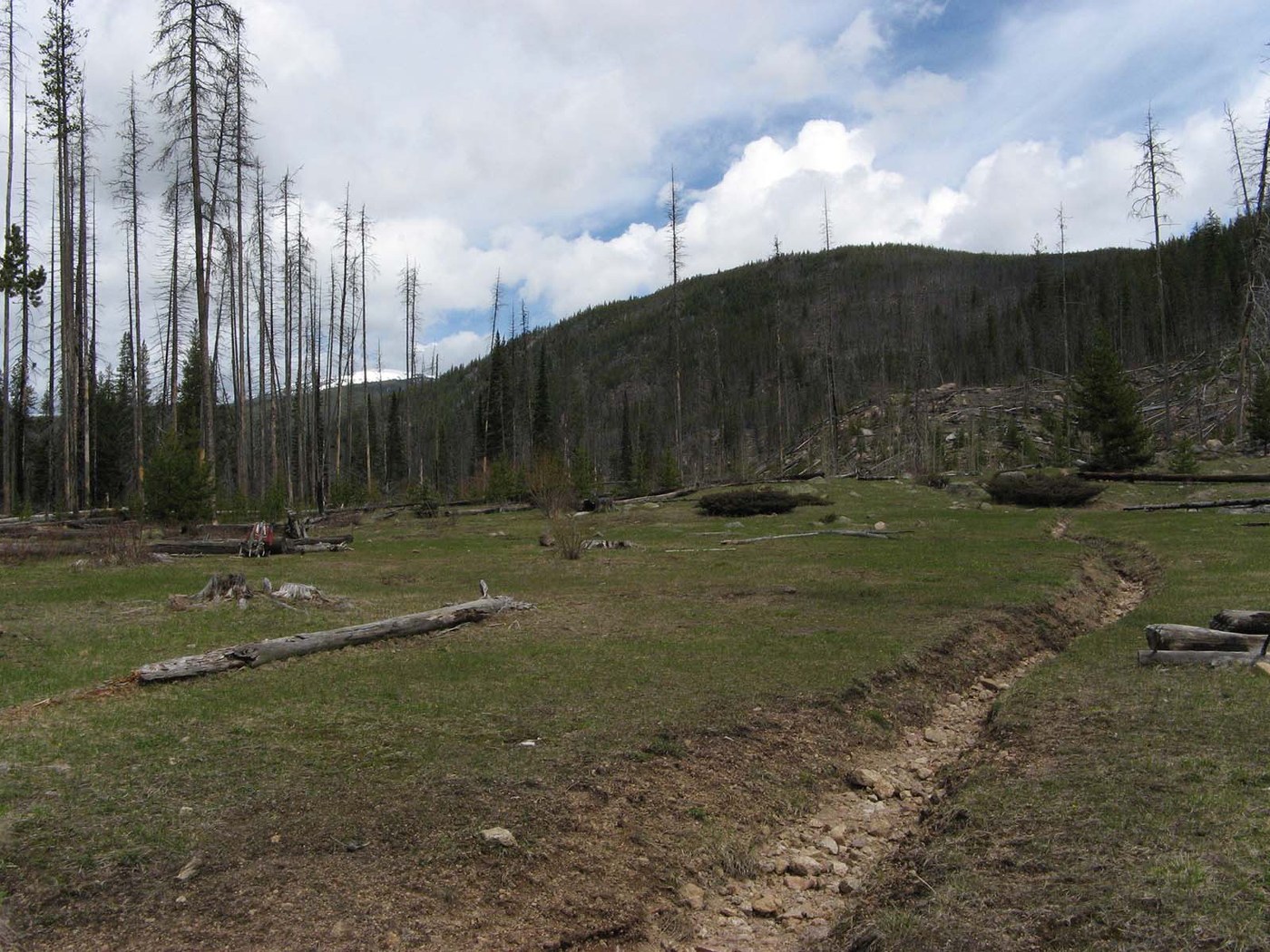 I hiked in 6.1 miles to Basin Cr and only encountered avalanche & rock debris at 0.9 miles with no snow after that. There's plenty of water on the trail after 4 miles in the form of mud, lakelets, and streams. Logs over the trail are a minor impediment to hikers - have to go off-trail to get around a few of them. Stock will have difficulty.