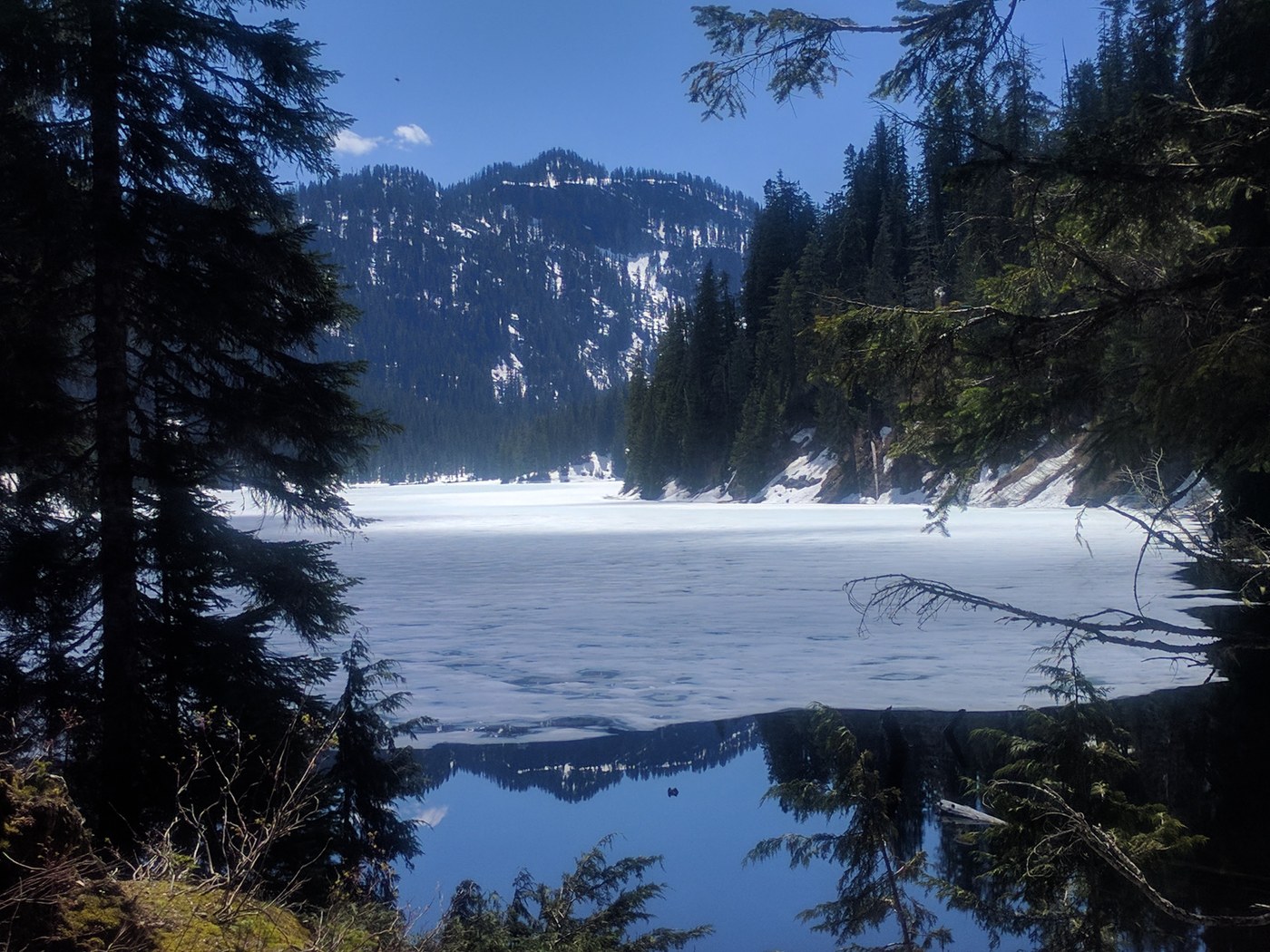 Headed out this morning @ 9:00 am from the trailhead. The parking lot and camping area were quite busy, but the trail was surprisingly empty on the way up. The trail has quite a few downed trees for first 6 miles but are very easy to navigate over. The real fun starts after the Nordrum/Snoqualamie junction. There are quite a few large downed trees blocking the trail. It's certainly passable - more of an annoyance than anything. The water is running quite high at times. Eventually, we grew tired of rock hopping (and failing) that we just started walking through. It was definitely hotter than we expected, especially considering there is snow up at the lake. Bring plenty of water or a filter as there is abundant water along the trail. There is intermittent snow on the last 1/8th of the trail or so. Once you reach the lake it becomes consistent snow. We stopped for lunch at the beginning of the lake and then headed back. Overall, it was a great hike.