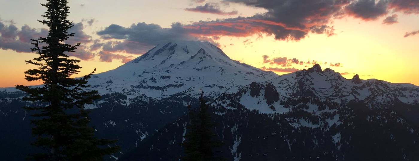 With a final hiking outing prior to finals for pharmacy school, we headed out to Mt Rainier and scored a permit for Shriner Peak Campground. We began at 1700 on Sunday. The trail was in great shape until approximately 2.6 miles in where we began to consistently hit snow, but soft - no microspikes needed the entire way to the lookout, just poles. We made it to the lookout at 2000 and set up camp just in time for the sunset.