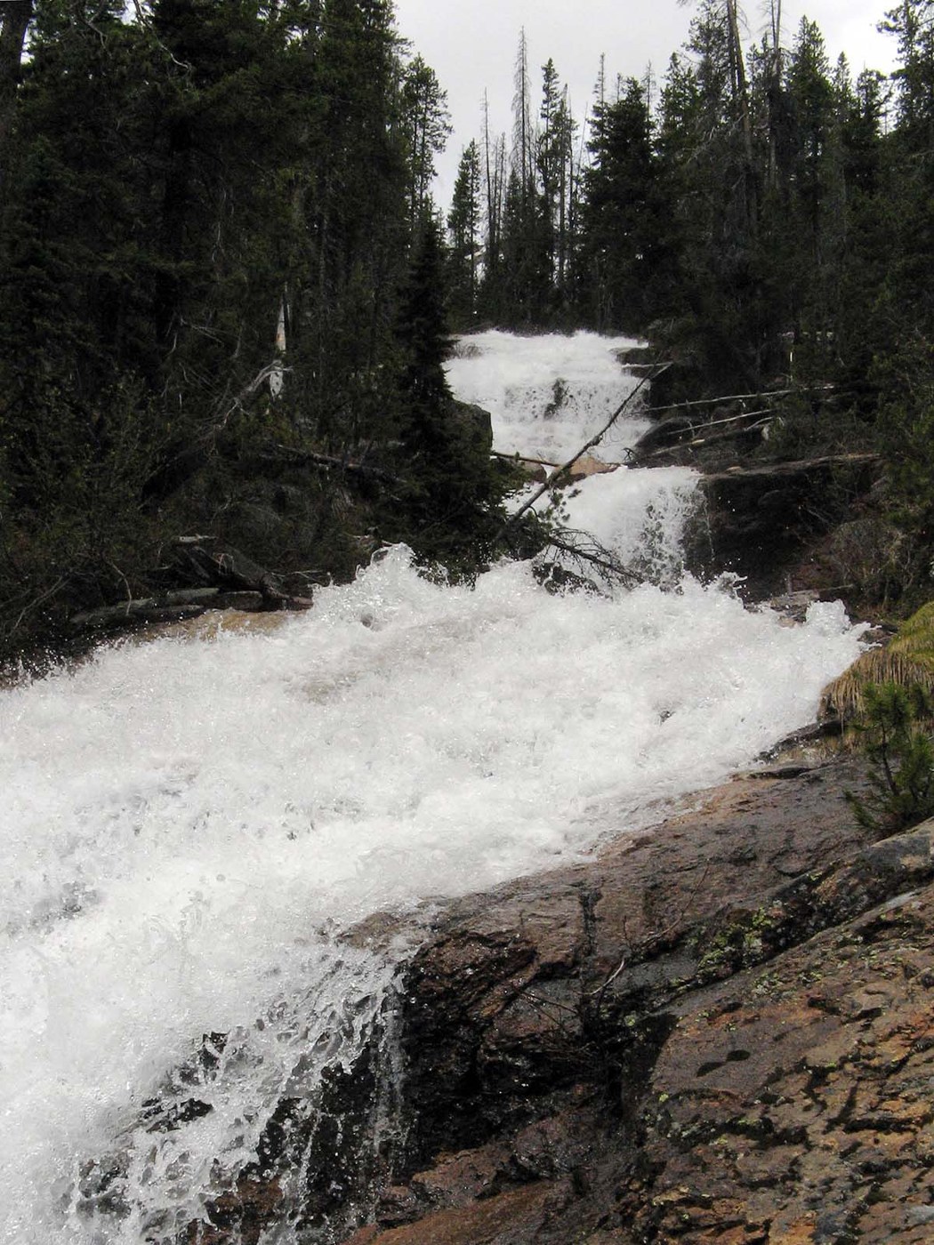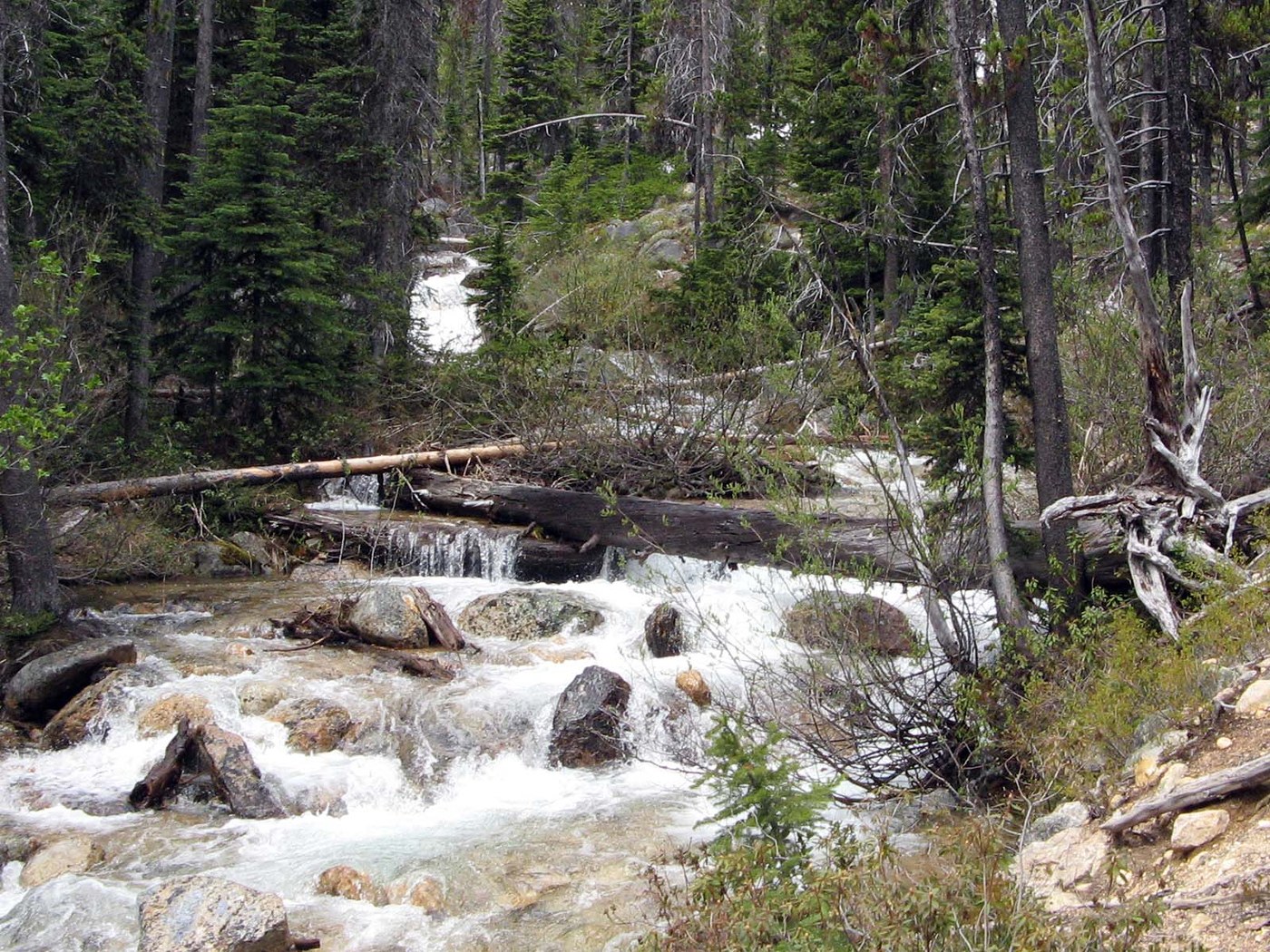 After 4.6 miles, the stream crossings get continually more difficult. The spring runoff covers most of the rock hops, but a log crossing can usually be found upstream to keep dry boots. At 6.1 miles is a major stream with crossing choices of: a ford, a 7" diameter springy log, or two 10" logs about 100ft upstream. At 6.4 miles, reach West Fork Cedar Creek, currently quite full with the spring runoff.
