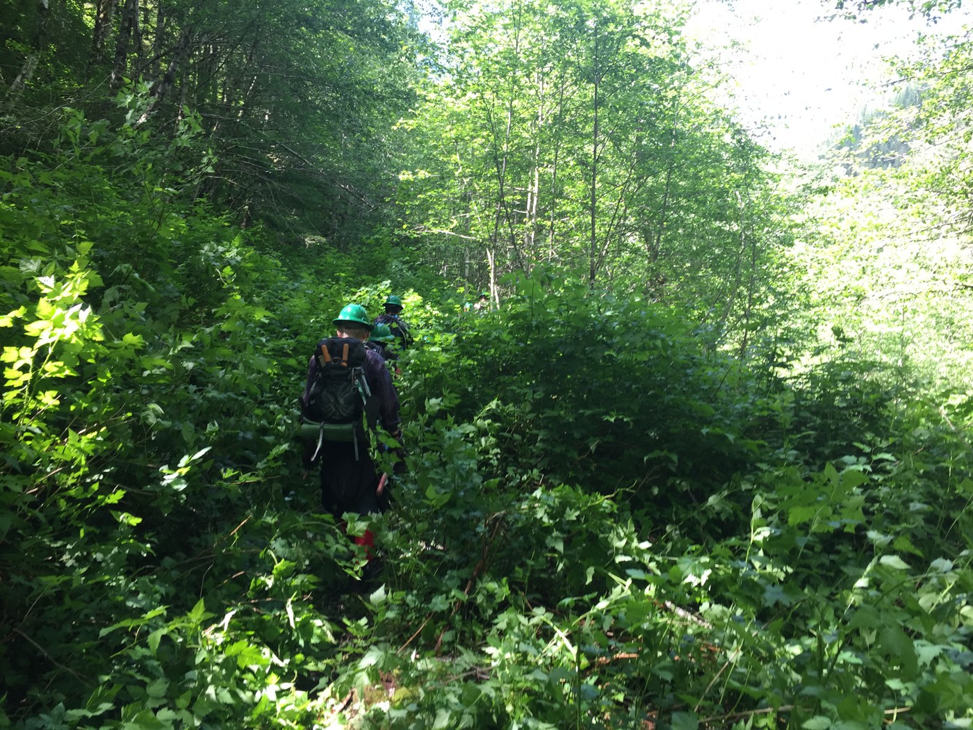 WTA volunteers have been hard are work restoring this trail since last year. The first mile is a old abandoned road and like many road-to-trail conversions the default path is straight down the middle. Alder trees, salmon berry and other such early colonizers grow in from the edges and what you end up with is a long straight tunnel of green.