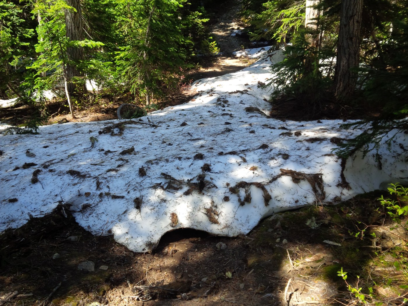 I headed back down to Pete Lake to spend the night. I imagine this trail will be much easier to hike in a few weeks. The snow fields are forming dams in places, flooding the trail. In a lot of places, the trail is a stream. Expect to get your feet wet. Also, I could not have made this hike without my trekking poles.