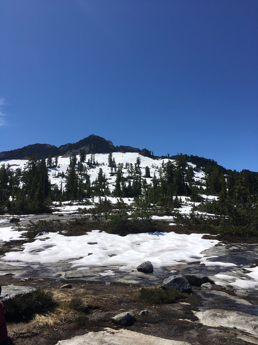 Getting up: Constant elevation gain for the first part (1.5 mi?) will definitely get your heart beating. Got to the snowfields the latest trip reports have mentioned in about 1.5 hrs. With a general idea of where the Pass was, my hiking partner and I were able to find our way in about 30-40 minutes. The cairns at the very end were incredibly helpful. The view was a nice payoff, but if you aren't comfortable route finding, I suggest turning back. We relied on our footprints in the snow to guide us back, but with the warm day, our prints melted out. We were thankful for those that followed our path (we broke trail) for creating a more obvious trail.