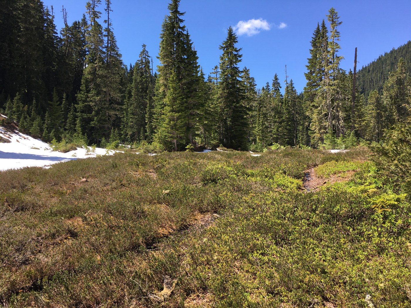 The road is blocked off where these two trails begin. The road has a few potholes but other than that easy to drive. The first couple of miles are on an old logging road now a trail, a little over grown in places and muddy, but not bad. The last mile or so begins with a steep trail. 1/3 up the steep climb you can stop at a nice little area by a beautiful water fall. My son and I had a little lunch there. Continuing up the trail it evens out and you come to a sign that say "Glacier Peak Wilderness". There are two very large tree that have fallen across the path. Go around the root side and you will see the trail again. Continue on a short distance and you will come to the valley and then the lake. You will be glad that you made the choice to continue up the steep trail.