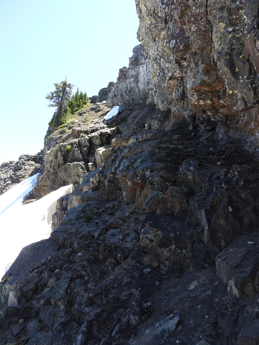 I saw a much easier and safer way down that went down the NE side of the summit. It led to a ramp that was easier to descend. I went down to a steep snowfield and went onto the snow and traversed the steep snow southward to get back to where I started off on the east face. An ice ax would've been nice on this steep snow, though the snow was just soft enough to make it easy enough to cross. I traversed some more loose scree slopes to get back to the bottom of by ascent route, then got back to the ridge back to the south summit and the trail down.