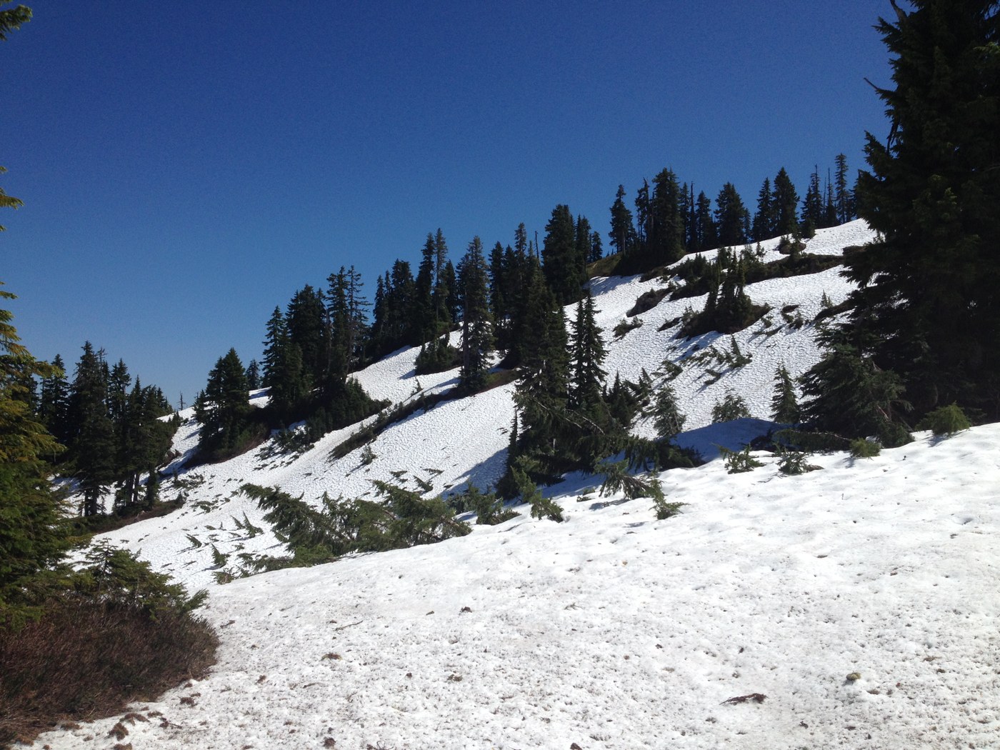 After you’ve navigated through the meadows, I would advise following the ridgeline all the way to the top. According to the map I had, the trail (which is buried under the snow where you can’t see it anyway) goes around and switchbacks up to the top from northeast side of the butte. Don’t go that way. Stick to the ridge line. You will find a steep boot path that is mostly melted out that takes you to the top if you stick to the ridgeline.