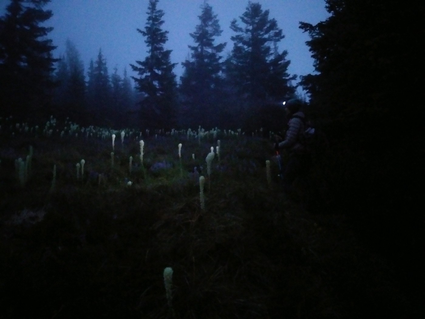 Put on some headlamps and layered up (it was 40 degrees and windy... where is summer!) and hiked up to the fire Lookout hoping to get some night hiking and spectacular sunrise. The clouds started rolling in thick as we approached the trailhead and drowning out the moon and our hope for a sunrise. We walked the not quite mile of old logging road to the trail and climbed steep switchbacks over rocks with only headlamps for light, feeling the biting cold wind and clouds surrounding us. I was scared to hike at night and also should have been scared of the cliffs we were climbing almost blindly up. I pushed through the fear though and climbed each switch back and I saw lots of wildflowers dancing in my headlamp beam. I was spooked by birds and mice and squirrels and the occasional smell of some other animal near by that we think was a bear (smelled it occasionally on the road from the parking lot and periodically while climbing the hill - that was probably the most unnerving part). Made it to the fire Lookout and it was completely clouded over. We noticed a couple of sleeping bags in the lookout (if that was you, sorry if we woke you when we stopped to enjoy our coffee and "sunrise" aka cold wind and thick clouds) :)