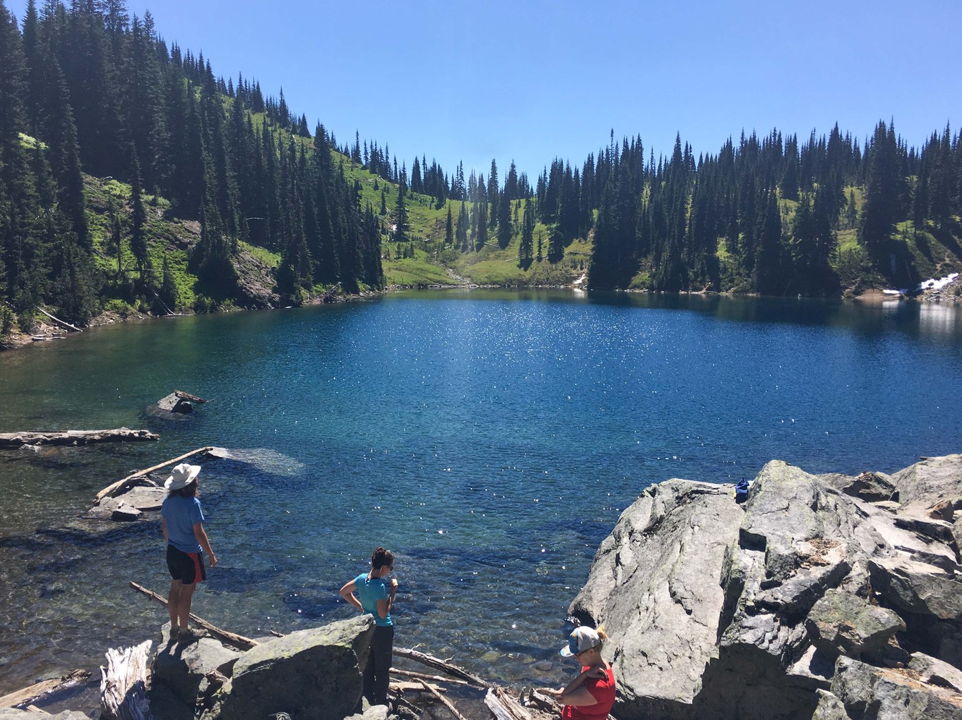 There were two other people at the lake when we arrived, at the end of the first boot trail that leads to the south shore. If you keep following another boot path that forks north, you will come to the boulder field at the north shore within five minutes or so. Trail is easy to follow. Great spot for sunning on the rocks and a nice shallow entry for the icy plunge I took in the lake.