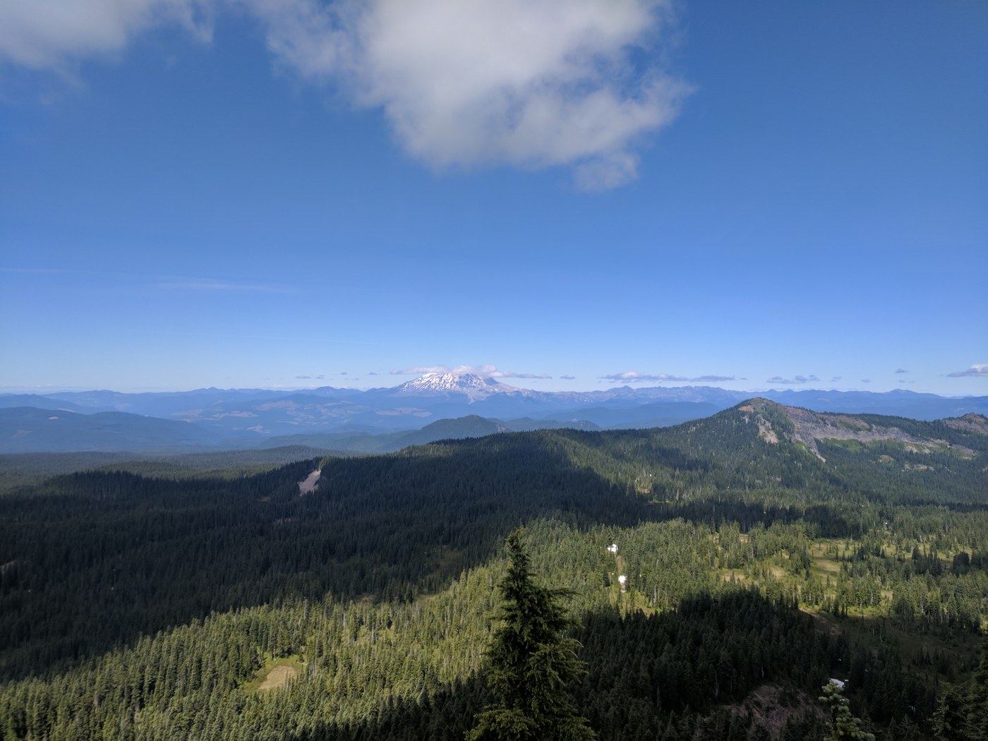 The brief views from the top of Lemei Rock were breathtaking. Able to see Mt. Jefferson, Hood, St. Helens, Adams and Rainier. We stopped and paced along the top swatting mosquitoes for about 3-4 minutes.