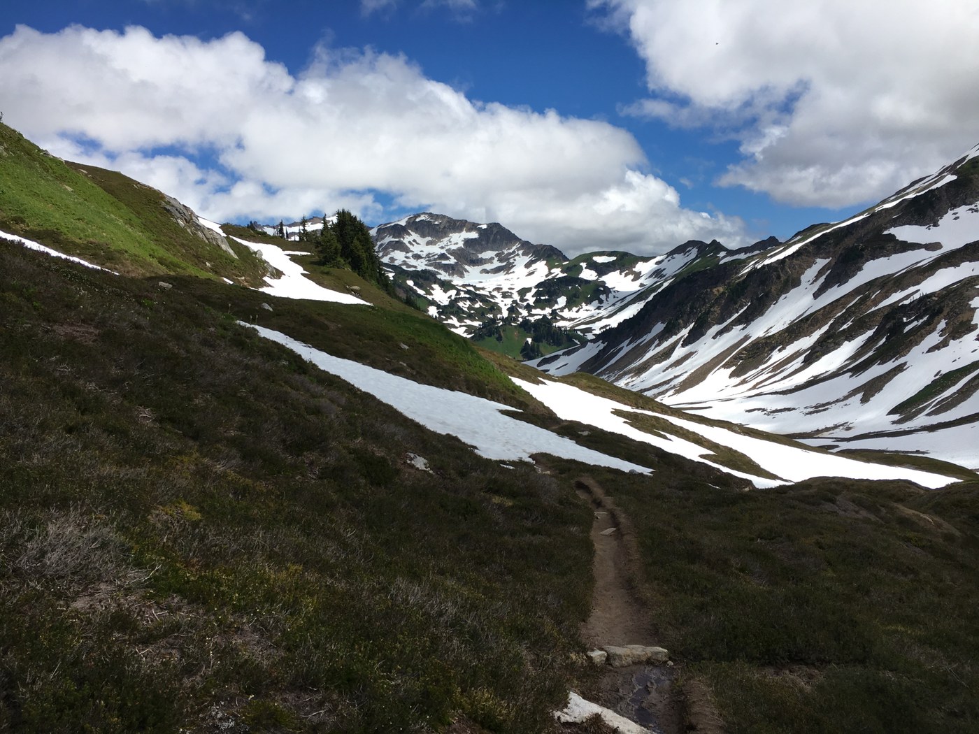 The foam creek trail still had quite a bit of snow when I passed through -- it would be doable I'm sure now, but I would bring microspikes or yaktrax in case you run into snow. Descending down into the meadows would also be a bit tough on the knees...but we didn't come across any scree thankfully!