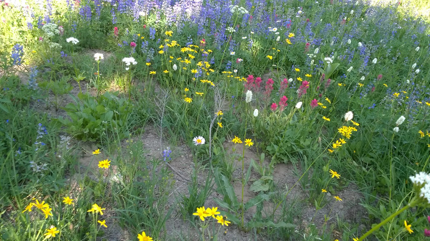 Our first thought today was to hike to Dewey Lake. We started in that direction. The flowers were glorious! Not too many people when we started at 9:30, the parking lot was fairly empty and newly paved. We passed a few people coming up the trail from Dewey lake who said the bugs were brutal - both biting flies and mosquitoes. So.....we were almost to the turn off to go down to the lake and we decided to go back the trail and head up to Sheep Lake instead. We met lots and lots of people coming up the trail by now. The trail to Sheep Lake is pretty exposed and it was getting quite warm by now. The lake was beautiful and refreshing as usual. There were not as many flowers as the ones on Naches Trail. We cooled off at the lake and put our feet in the water. Several families were at the lake and kids were swimming in the water having a good time. Passed a few overnighters coming in to camp at the Lake. We returned to the car and the trail was really hot by now. My dog was heading for the shade every chance she got and her paws were getting hot on the trail. Stopped at Wapati Woolies for our usual Espresso Shake and look around the store. Love that place! The smoke was very evident but in spite of it we could see The Mountain. Yay! Iove summer and sunshine!