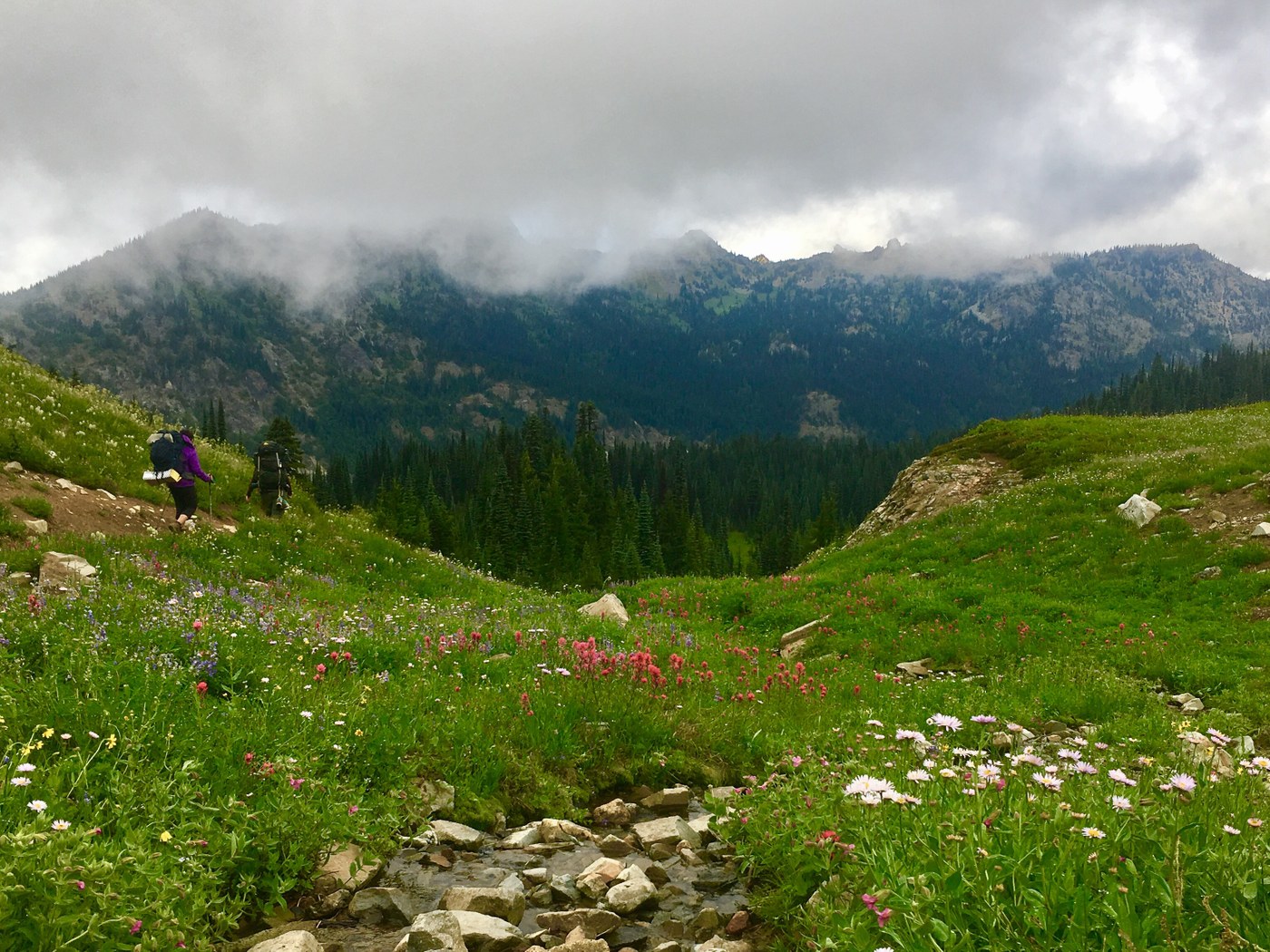 Gorgeous trail, even if we missed the mountain views because of rain! Lakes, berries, and wildflowers for days! We did 2 nights, 3 days, about 10 miles per day, going from White to Chinook, staying at snow lake on night one and two lakes on night two. I was glad we grabbed a map of the whole trail, because there were a few junctions that puzzled, but all in all a very straightforward trail. The grade on the trail is seldom very steep, though there are some longer stretches of uphill. I would recommend if you're a slower hiker that you add an additional night so you have time to stop and enjoy your hike… faster hikers should also make time to stop and enjoy, in my opinion. There's so much to see!
