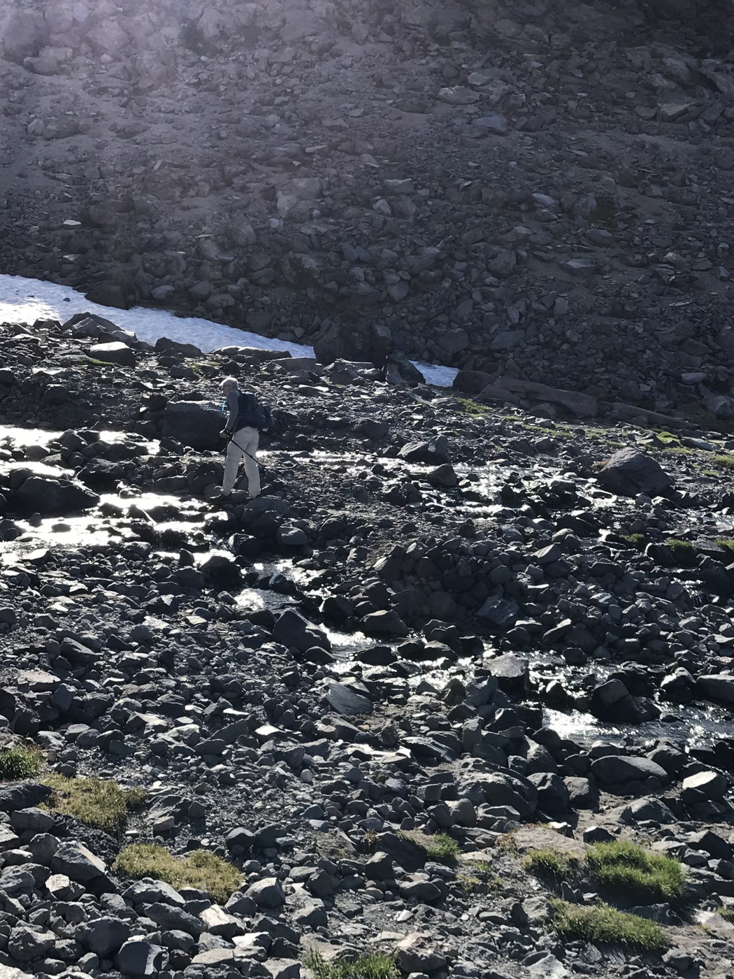 Parked at Paradise parking lot at 6:40 am. Just a handful of cars there. It was 34 degrees out since the sun was still rising. Visitor center w/bathrooms was closed at that time but bathrooms by the lodge were open. Started at the stairs and went straight on the Skyline Trail. Continued to follow the signs and Trail to Camp Muir. (No one else was out on the Trail at this time.) Wildflowers were in full bloom and beautiful. Got to Pebble Creek where the Skyline Trail ends. Crossed the creek and hiked along a small rocky ridge to the snow fields. Used trekking poles at this point for the duration of the climb. Did not bring microspikes upon recommendation but should have. It would have made the hike just a little easier and faster. Followed boot tracks up the snow field. You basically climb straight up for two miles. Got lucky with a beautiful sunny day. Pealed off the layers as we continued to climb and as the day got warmer. Views were amazing at any given point and time. Made it to Muir in 4:20. We took our time from the start and made sure to keep our heart rate down. Ate lunch at Muir and watched climbers come back from the summit and groups coming up to summit. There are bathrooms (composting toilets) there to use. I was also able to get cell service. Tried to glissade down as much as possible. It's the quickest, easiest, and funnest way down. I did hear some rumble on the way down. Looked back and watched a huge rock slide. Once we got back to the Skyline Trail it was very busy. Overall it was a terrific hike! Recommend: Layers, sunglasses, sunscreen, poles, microspikes, and plenty of water.
