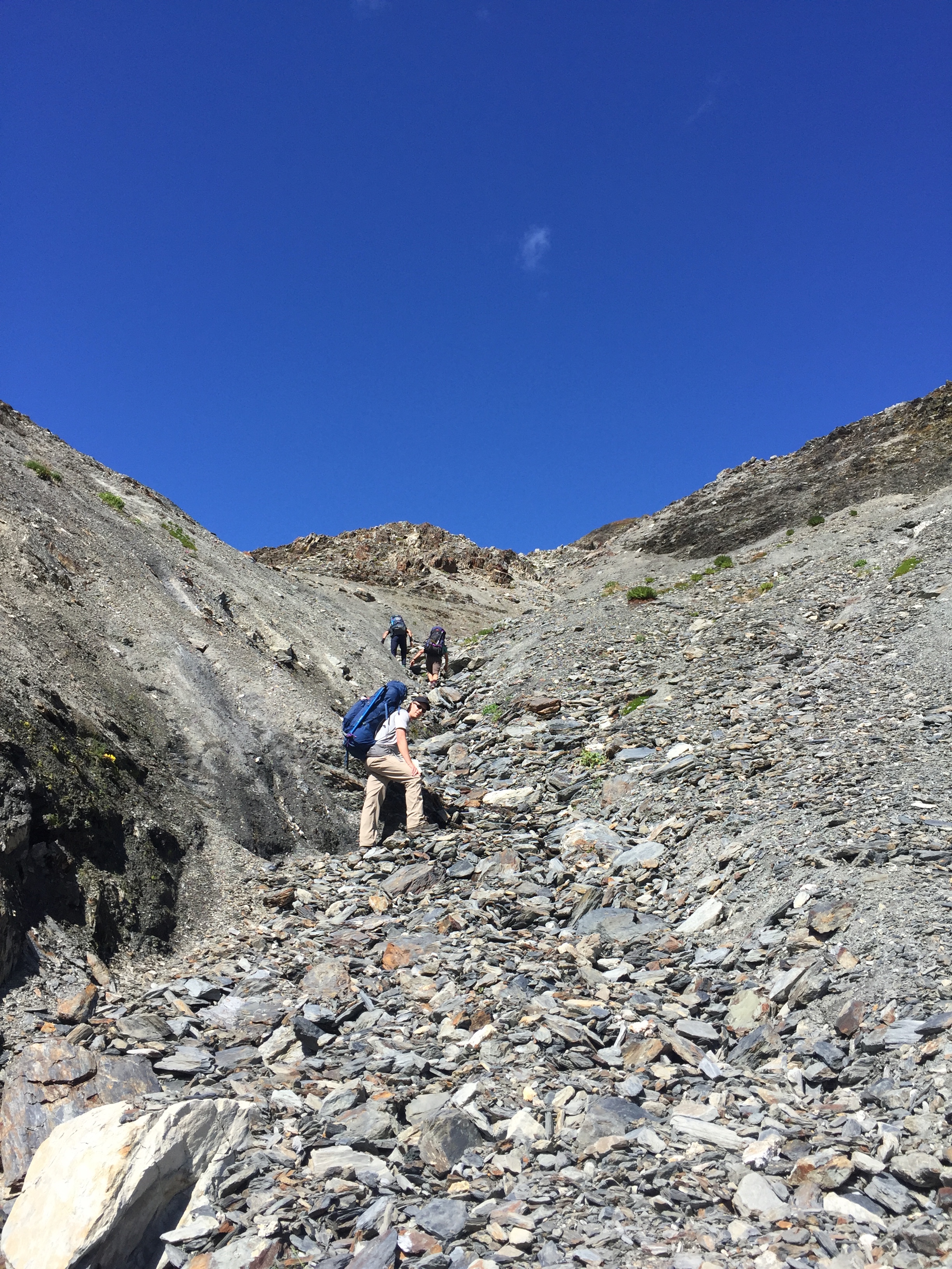 Once at Dodwell-Rixon pass, the way over the ridge to the north was not at all clear. We ended up choosing a curving scree gully which turned out to be an excellent and very direct line.