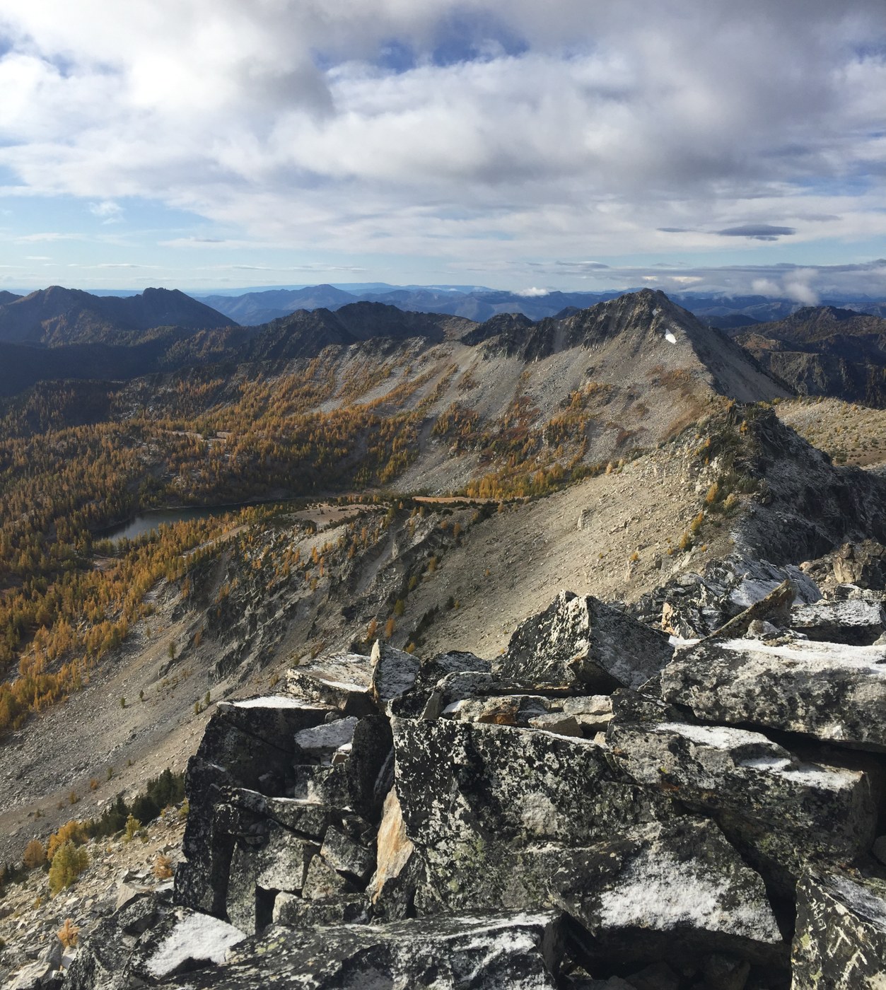 The trail up to Cooney Lake was not difficult (only about 8 miles and none of them very steep at all). The larches had begun to turn, as had the huckleberry bushes. Fall colors were out in force!!! There were two other parties camped there. The wind was gusty from the early evening until the middle of the night, and there was a light dusting of snow on the ground when I awoke. Fall is here.