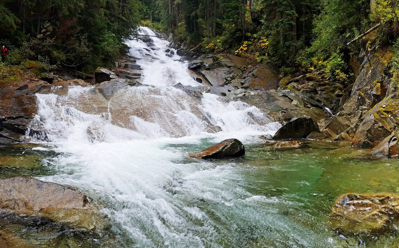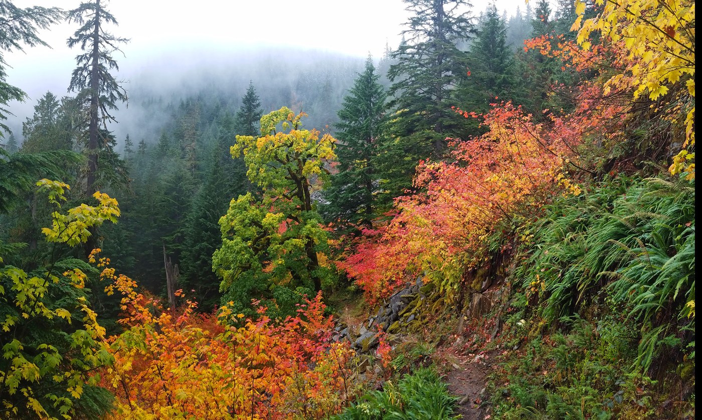 Grace, Jodi, and I started this journey at the Dingford Trailhead. The 6 mile dirt road to the trailhead is in better than usual condition but I would still recommend a vehicle with a little clearance. We mountain biked 4.7 miles up the gated Middle Fork Rd to the Goldmyer Hotsprings turn off. We locked up the bikes here and continued up the Middle Fork Rd for another 3 miles. There were some very impressive old growth Red Cedar and Douglas Fir trees along the way. One particularly large Doug Fir just downhill from the road had a very unusual triple crown. It looked almost like a candelabra that you usually only see on a very old Cedar. There are also some view points that take in some very colorful Vine Maple glowing fluorescent yellow and orange. Fall color this year is quite good.