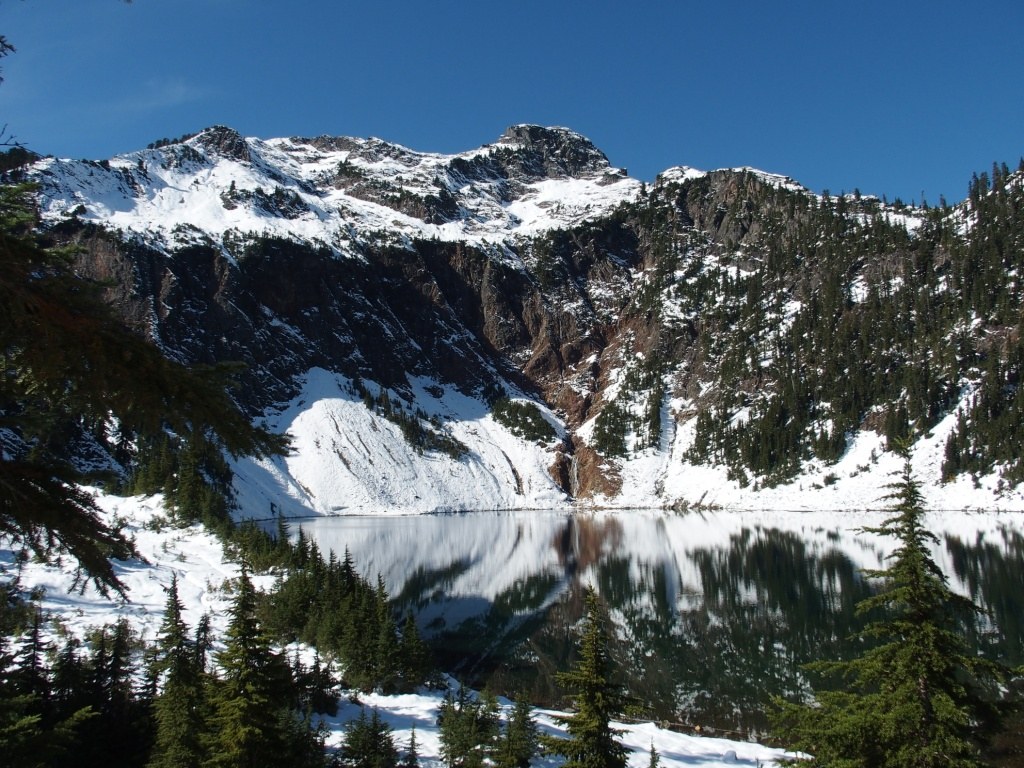 Once you reach the townsite, you will cross a sturdy bridge and pick up the trail behind one of the old cabins. The TH is well marked. Now it's 2 miles uphill to Poodle Dog pass.The trail is well made and easy to follow. First switchback thru the woods, cross a small stream, then head up again. Be sure to turn around and look at the views behind you as you climb out of the woods. The snow was light and easy to travel on until approx. 3500', then as the trail got steeper, the snow got deeper. Poles were a help. I didn't have a snow basket on my poles, but wished I had put one on. I did not use spikes on the way up, but did on the way down. At the top of the pass the snow was over a foot deep, luckily some hikers had come in before us and broken trail. There were 3 of us and we broke it further, so it should be easier. Head down to the right from Poodle Dog into the lake basin. You will see several tarns, grey from the slushy snow. Pass the tarns and head up over a small ridge to the lake. Behind the lake is Silvertip Peak, sparkling with fresh snow, a beautiful view for a relaxing lunch! We had the trail to ourselves all day, everybody parked at the TH must have been at Gothic Basin.