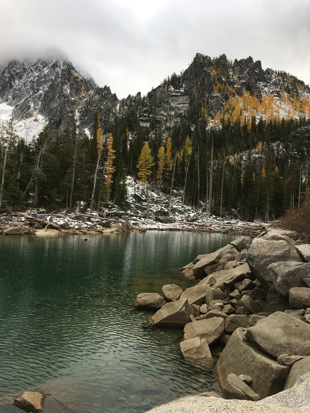 Spent the weekend camping at Ida Creek Campground on Icicle Creek. It was a 30 minute drive from the campground to the trailhead. Arrived at 1:30 pm, the parking lot was full and there were cars parked along the side of the road for at least a half mile. We got lucky and someone left as we arrived so we were able to park in the lot. The trail was in good condition, a little muddy in places but snow free. There was a minimal amount of snow off the trail during the latter part of the hike. About 2 miles in you'll come to an intersection with signs pointing you to Colchuck Lake or Stuart Lake, stay to the left. Stuart Lake is still roped off. We stopped to eat our lunch on the way up and made it to the lake just before 4. Enjoyed the views and the larches scattered around the lake before heading back down at 4:20 pm. Made it down in just under 2 hours, and had enough light that our headlamps weren't needed. Besides the amount of people on the trail it was an amazing hike, I would recommend going on a weekday if possible to avoid the crowds on the weekend.
