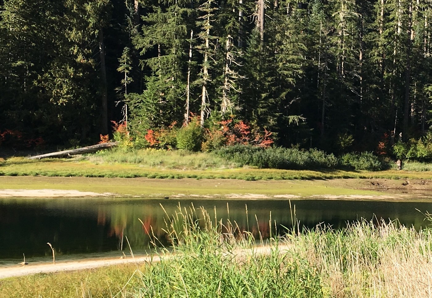 Forgot that the game gate would be closed at NFD Rd 2361, but the weather was warm and sunny so a couple of road miles at each end of the hike was OK. The trail was in good condition and easy to follow but it will be several years before it is any more than a walk along a decommissioned road. There were two large trees across the trail but steps of piled debris had made over both of them. Autumn leaves around the lake were beautiful, but the lake itself was in sad shape. It was down ten to fifteen feet with no inlet or outlet. Cracked mud and dry, bleached moss all around it. On the other hand, the solitude that I was seeking was complete. A short, easy hike even with the road closed and the only sound heard the entire time were ravens