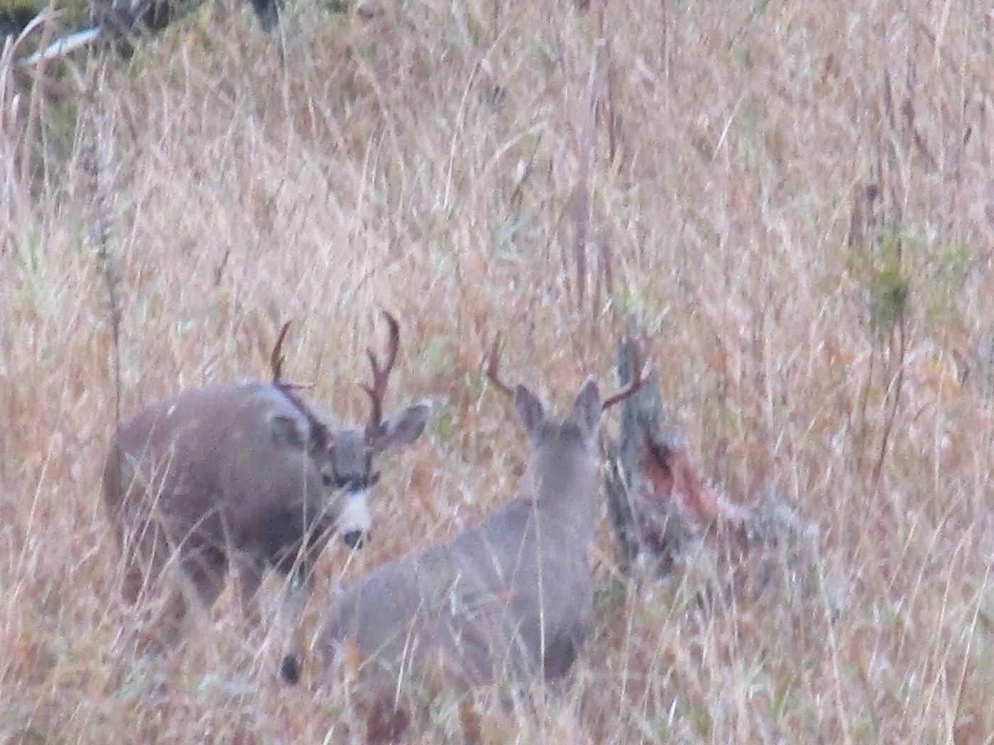 Just off the Red Barn Trail, there is a sheltered spot under a large fir that overlooks Beaver Lake Marsh. (It used to be Beaver Lake, but that's another story) Years ago I had cleared it out and put a board down to sit on; and it's still there. I noticed two young bucks on opposite sides of the meadow. They met in the middle, and spent the next hour hangin' out and wrestling. Seemed like a pretty friendly affair, and they were still there when I left.