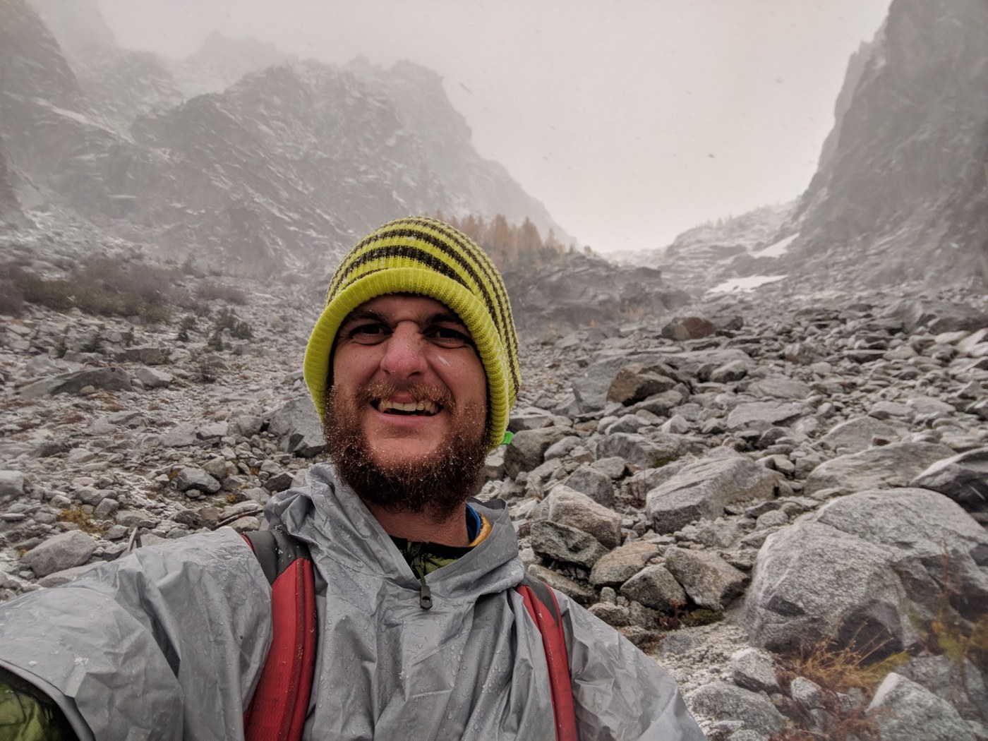 Really wet conditions to the lake. We were tentatively headed to Dragontail Peak. Snow on Aasgard and the moisture turned us back about halfway up Aasgard. It started snowing, we had the gear for the snow slopes (axe, crampons), but were a bit wet so opted to bail for another day. Met great people at the lake on the way down. They had beef jerkey and shared. Win.