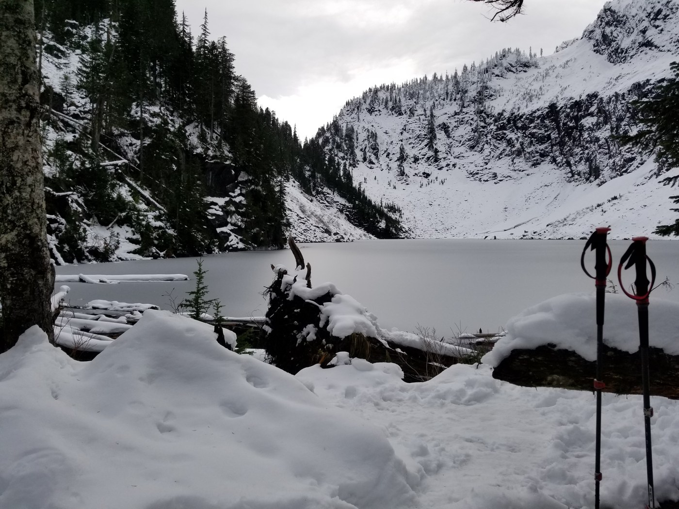 This slightly hungover Traildude walked it off on the trail. Arrived at the trailhead about 9, only three cars in the lot. The trail is clear until about the last quarter mile to the lake. Traction gear strongly advised for that section. The lake is just beginning to freeze.