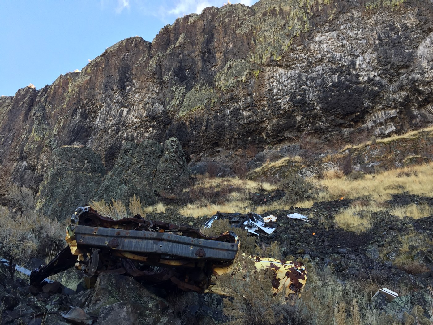 Having not been out for a couple weeks I needed some outdoor therapy. Raining on the west side I headed east and got blue sky, warm temps and sunshine. Met up with a friend and her 2 dogs. So 2 girls with 3 dogs clocked in 4.5 miles. Well the dogs probably did 15. We parked down by a gate below the 2 upper parking areas and headed to the waterfall. Along the way we found at least 2 but maybe 3 cars. What the heck. The road was pretty high at that point. Hopefully they were empty when they went over. There was also a fridge. The waterfall was so beautiful. We hiked to the base of it. A little windy so it was misty but it made great photo opps. On the return back we found a truck. Well the cab of it. I think higher up was the rest of the truck but we didn’t hike up to it. There were two huge rocks/pillars that at one point we’re together and then split. I’m guessing here. You can walk through them. It appears people were rock climbing on them but there’s a no trespassing sign on the rocks now. Next time we’ll go up top above the pillars where the climbers are. I like watching but this girl will keep her feet planted on the ground. Love this place and there is so much acreage to explore. History too.