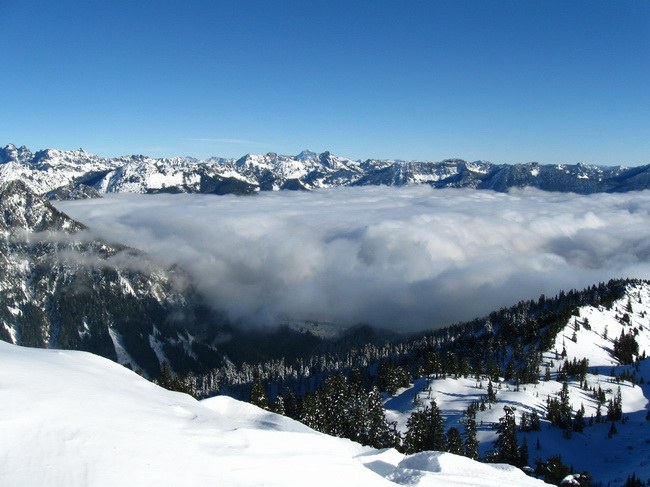 High-pressure, clear weather, temperature inversion, interesting to see the valley fog on the east side. Oddly, it was very windy in the forest near the trailhead when we returned in late afternoon, just ripping down the valley -- enough to worry about falling trees -- a 12' dia. fell across the trail (it's too high to obstruct the trail).