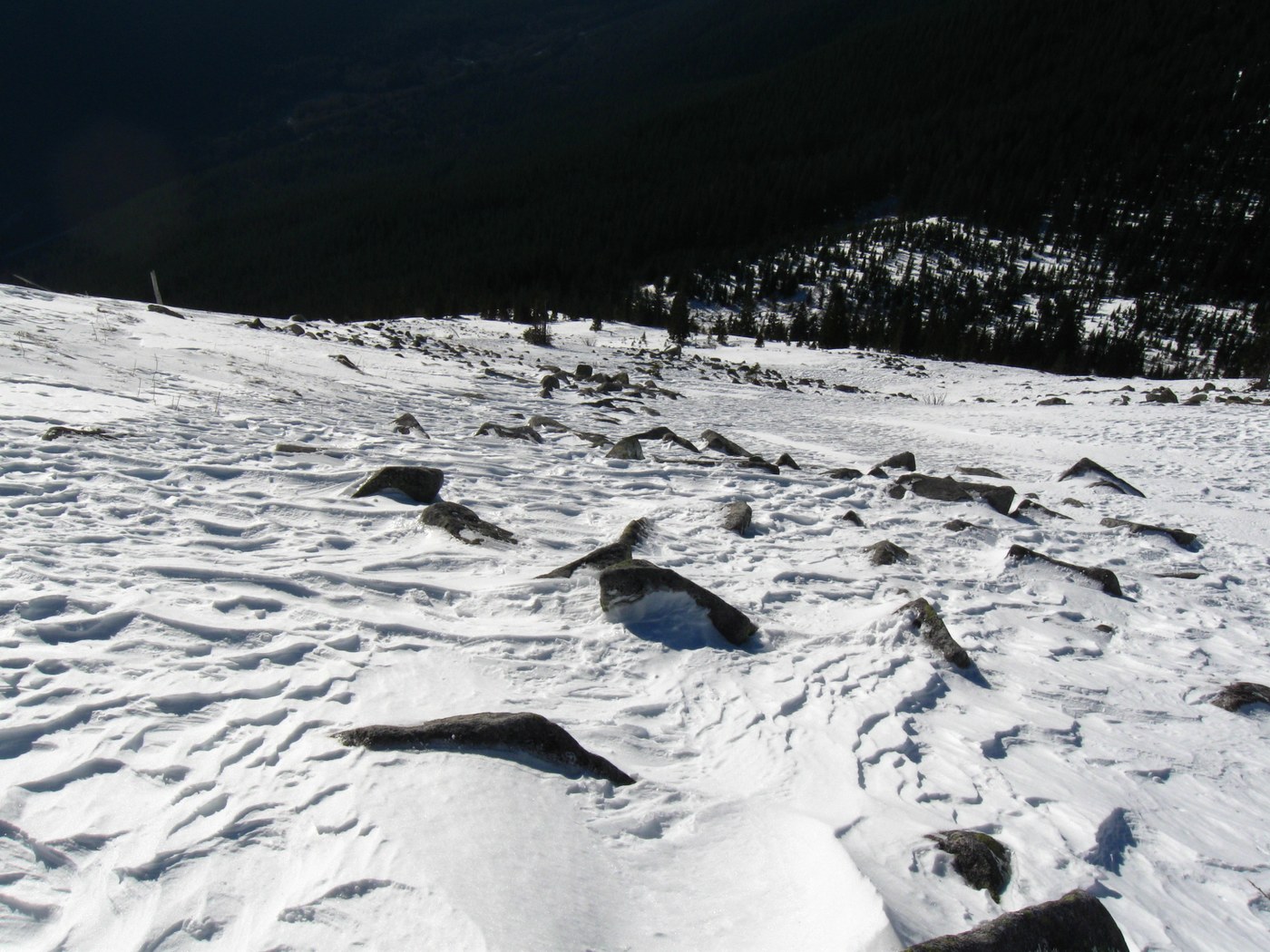 Up high, the snow was getting wet and heavy in the sun. It's not very deep, but I was making it slide on the descent. Remember that this is the most notorious avalanche site in the state. Many rocks are still exposed, esp. on the SW ridge and the west bowl. Not enough snow for skiing. The well-packed path on the trail peters out shortly after it reaches the SE ridge above treeline.