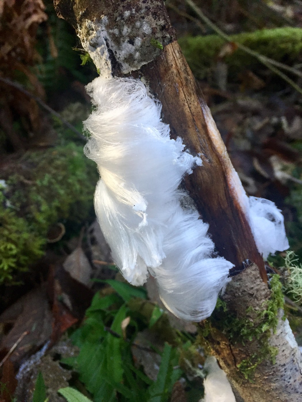 The trails are in good shape. Most spots that would be muddy are frozen. The muddiest spot is on the Red Barn trail by the English Pond cut off. It's not so bad that you couldn't just tromp right through or take a running jump to get to the other side. There's lots of hairy ice here. Bright white patches that shine in the otherwise green and brown woods.