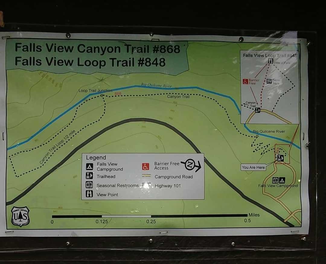 Parked at the campground gate as the campground is closed so you can't park at the trailhead. It was full even though it was a not-so-nice day. Right after entering the campground you turn left to get to the day use area where the trail begins. Its about a quarter mile walk. You have two options at the trailhead, one very short loop to give you a look at the falls and the Canyon Loop trail which takes you along the river. The switchbacks on the canyon loop trail were a bit slick since it had been raining but fine if you took it slow and there was no trouble going back up. The trail itself was beautiful. Very well maintained and allowed for an easy stroll.