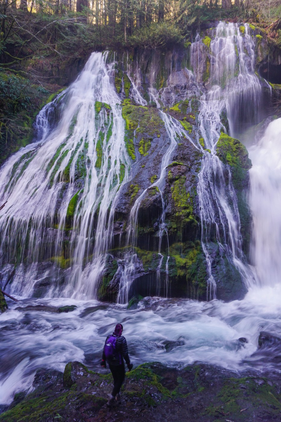 The alternate trail to the base of the falls starts a little further south from the parking area on NF-65 over a hillock (but before the junction with NF-6511). It's steep at some points and there is a little section with a rope attached to help with the scramble but you don't necessarily have to use it. Some slick roots and a few muddy spots, but it's pretty quick and you soon find yourself in a magical fairyland of tumbling rivulets and roaring water!