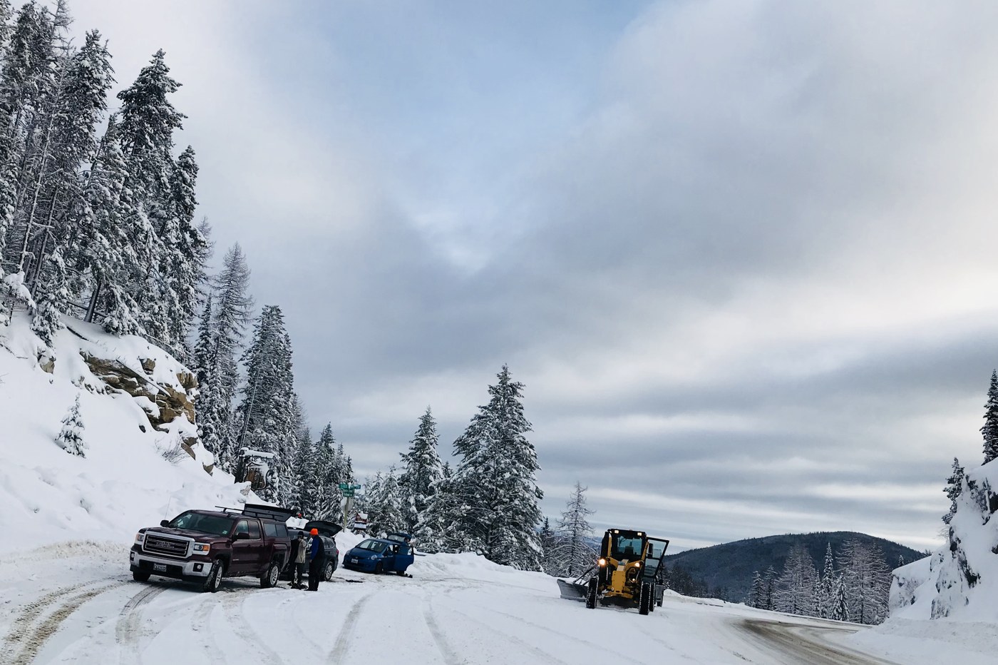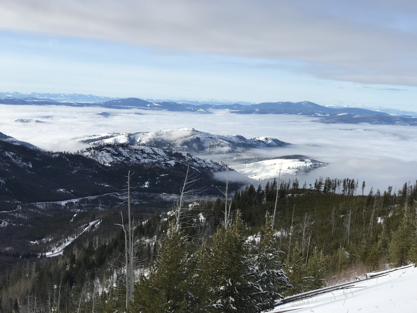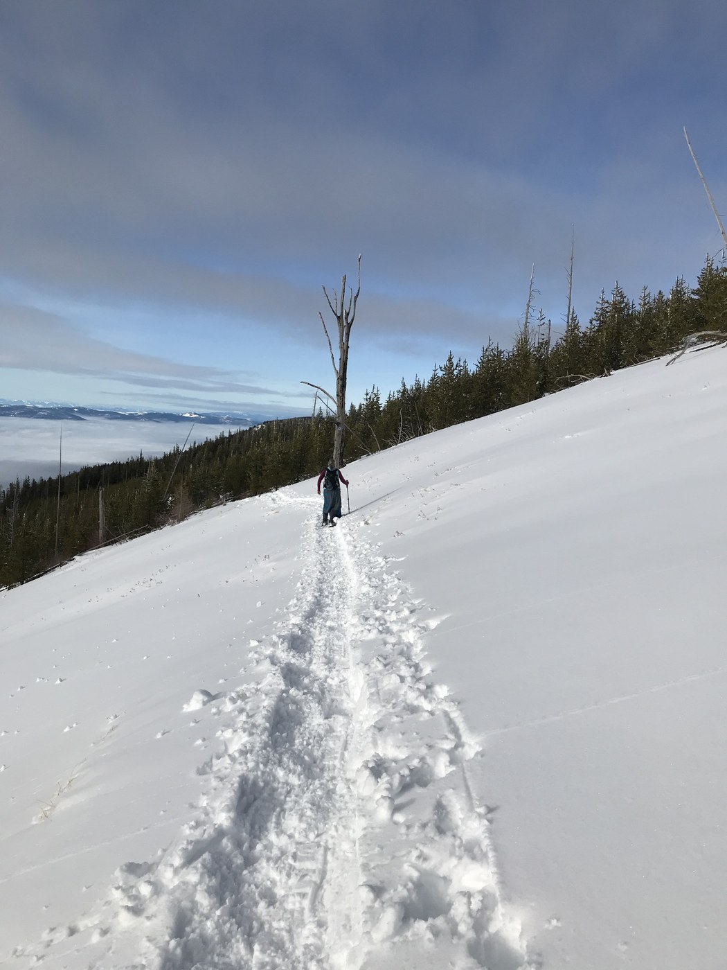 Group of 8 headed out for a Snowshoe trip breaking trail on the first half of our trip. A few areas we had to route find, and watching for cut tree branches really helped. Do check avalanche conditions before heading out, we saw no signs and crossed the “bowl” area one at a time safely. After a viewpoint lunch break halfway, we were lucky to have trail broken for us from people leaving the cabin at snow peak and the rest of their Trail was broken by us. We had to inform them that their car was bermed in at sno Park lot, and had not been plowed as of 9am, we had to park in pull out. They were prepared and all had shovels to dig the Subaru out if needed, lot was plowed and they were gone by the time our group made it out. Easy going from there , for both groups and enjoyed a sun filled day on this great loop around Sherman Peak.