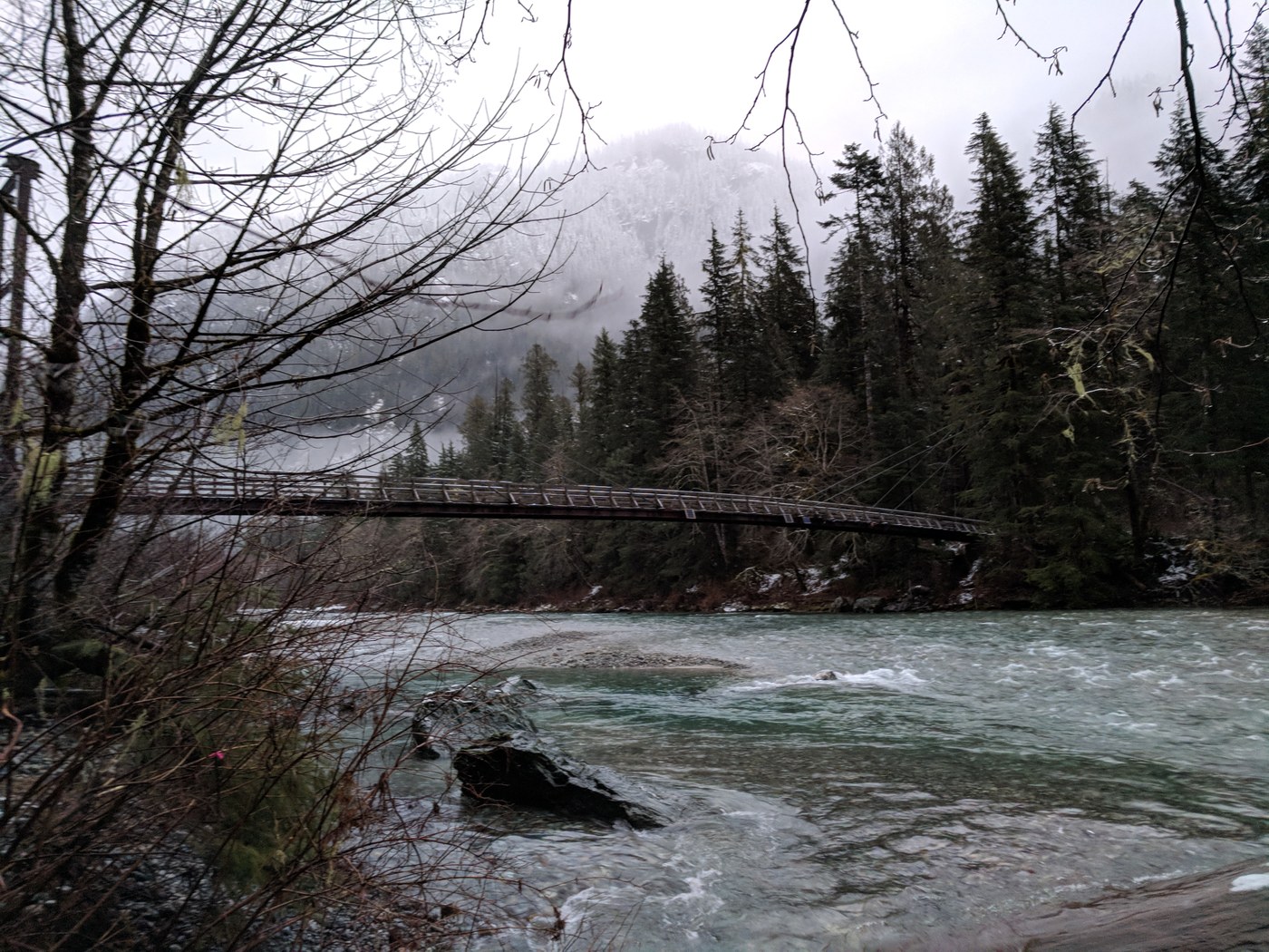 Trail in very good condition, it has inch or two of snow, but you can do all the trail in hiking boots. Trails is wet, because lots of wated falling down from trees. Within five minutes walking from TH you will see the bridge, here you can take great photos. In the middle of the trail there is another bridge wich is washed out, couple that went behind us turned back at this point, but we crossed this washout easy. After this washout no river views anymore, if you came for views you can cross washout, take pictures and turn back, but we hiked to the end. There few streams crossing and fallen tress after this point, but everything is doable.