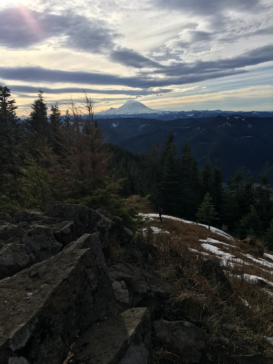 From the very beginning, the hike goes straight up. The trail is pretty rocky and not an easy climb up. We made it up in 1:45, and back down in 1:20. This hike is not an easy one and I don’t recommend it unless you’re in fairly good shape. Around 2.2 miles the trail becomes a creek/swamp and waterproof boots are definitely necessary. Around 2.8 miles in, the snow started and crampons or micro-spikes would have been nice. My friend had some and they helped her, but I didn’t and I slid around a bit (but it was definitely do-able without them). The views at the top were nice; it was very windy and cold. My dog made it just fine the entire way. Hiking down is rough on the knees (for reference, I am 20 and a runner with no knee problems).