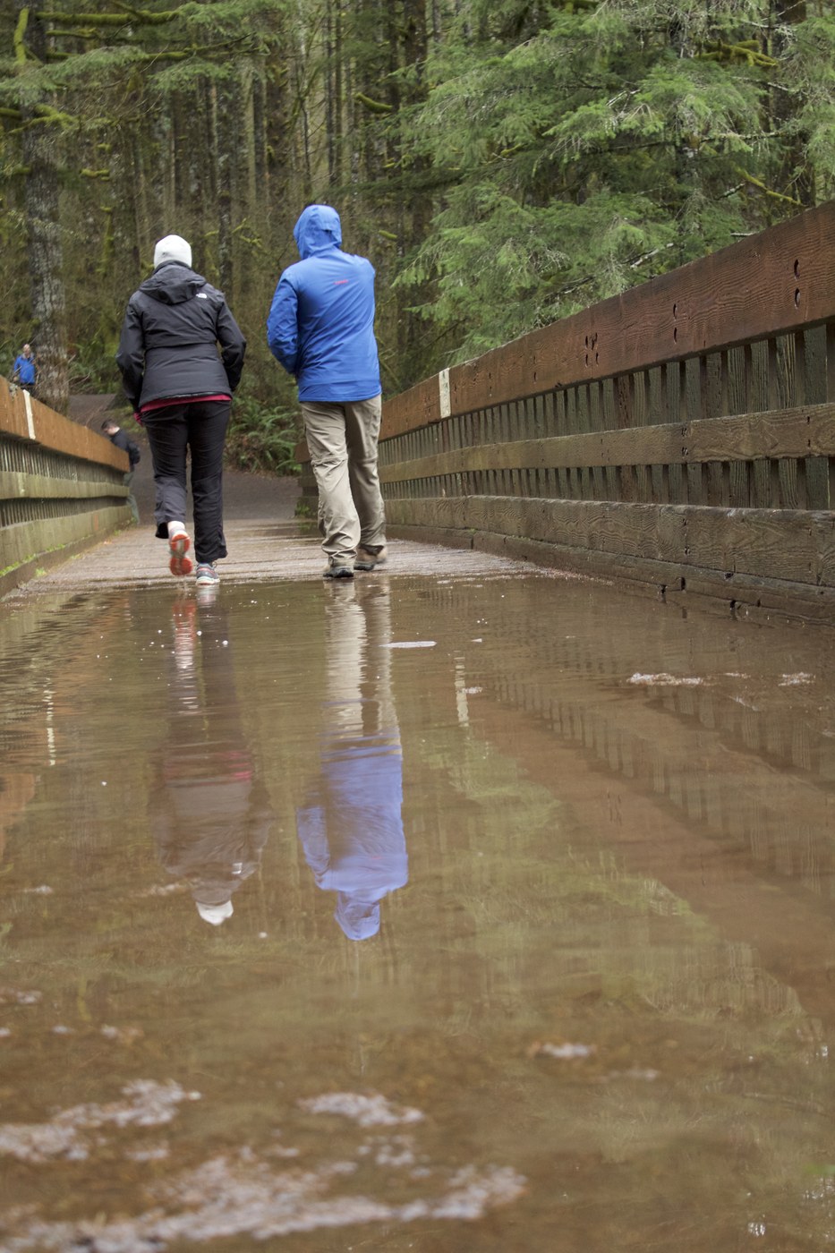 This was a very nice short day hike that we took with our family. It only drizzled once while we walked but parts of the trails were muddy or had large puddles. The river and multiple falls were very nice and roaring this time of year. The mossy trees and green foliage makes you feel like you're in a jungle. There were a few people out but it wasn't busy at all.