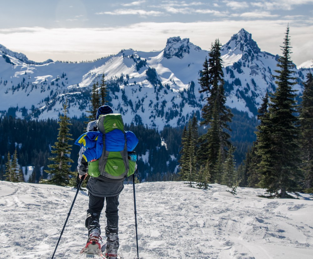 My 10 year old son and I snowshoed a short distance above Paradise roughly on the Skyline Trail and picked a spot with a perfect view of the Mountain. The snow was firm, but every few steps I'd posthole to my knees so snowshoes were a plus. It gets dark early at Paradise so bring a deck of cards or a book to occupy you after dinner and before sleep. We stayed warm with 0F degree bags and pads with at least an R-value of 4. A bottle of hot water at our feet helped, too.