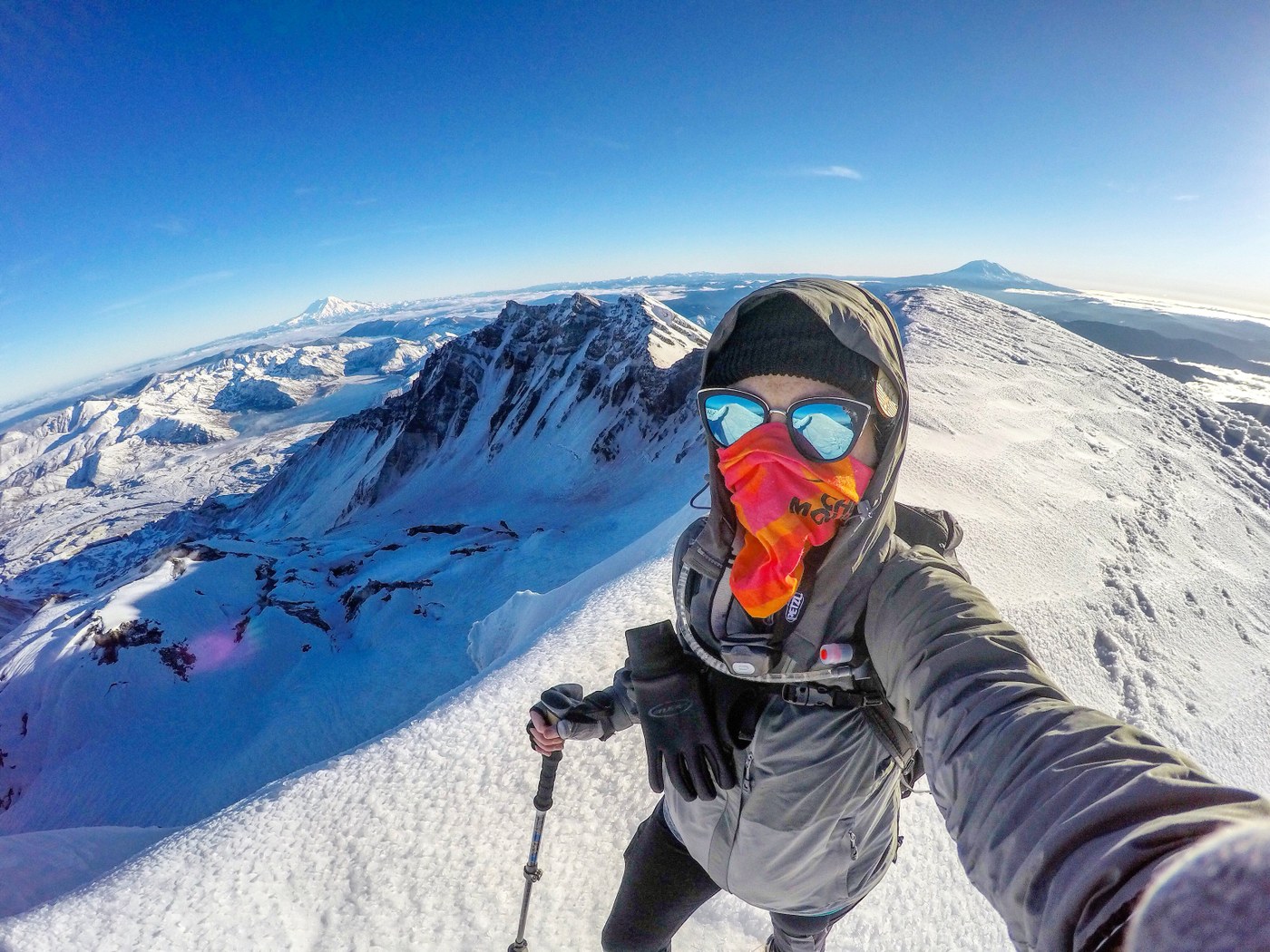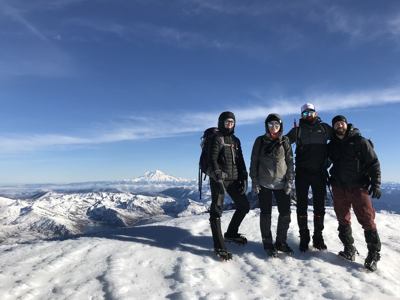 Car camped at the sno park the night before with intentions of starting at 5am. Nerves & the epic forecast got us so excited that we decided to make it a sunrise summit. We fell asleep around 10pm, alarm woke us at midnight & we were geared up by 1am. We signed the register, double checked our pack& used the privy one last time, but it wasn’t until after 2am that we started on the trail, which was covered in snow from the very start. Us girls opted for crampons while the boys maneuvered in micro spikes. This wasn’t so much a physical challenge for me as it was a mental one due to the cold temps paired with the occasional winds. I had several moments of anxiety over just how cold my fingers & toes were, despite wearing 3 pairs of gloves & 2 pairs of socks. The boys also had their struggles with busted backpack zippers, dim headlamps, crampons & leg cramps. While we hated splitting up & not reaching the summit as a group, us girls had no choice but to keep moving to stay warm. We peeked over a cornice to see Rainier just after 8am & the boys joined us for a summit pic around 930am. The views were perfect; we could see Jefferson, Hood, Adams, Rainier, Baker, Shuksan & the Olympics. We headed down just before 10am & couldn’t believe how many people were headed up. Literally, I think there had to have been 300-400ppl trying to summit this day, it was insane. Lots of people packing skis & snowboards, some even had dogs & puppies with them (after hiking to the summit, do they run after their owner who gets to ski/snowboard down?). We reached the car just before 130pm after taking a leisure pace down due to the soft snow & amount of people we had to dodge.