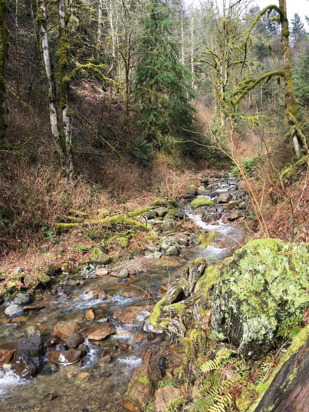 The trail continues for a short way past the coal mine entrance. This is shown on the Green Trails map but not the interpretive sign. It’s a little muddier than the preceding trail and has a couple of trees to go over and under, but is not at all hard to pass. It brings you down to the creek in a very pleasant and open setting. I did see a trail heading up the slope to the east, possibly intersecting the Hobart middle Tiger trail above. But I didn’t verify that.