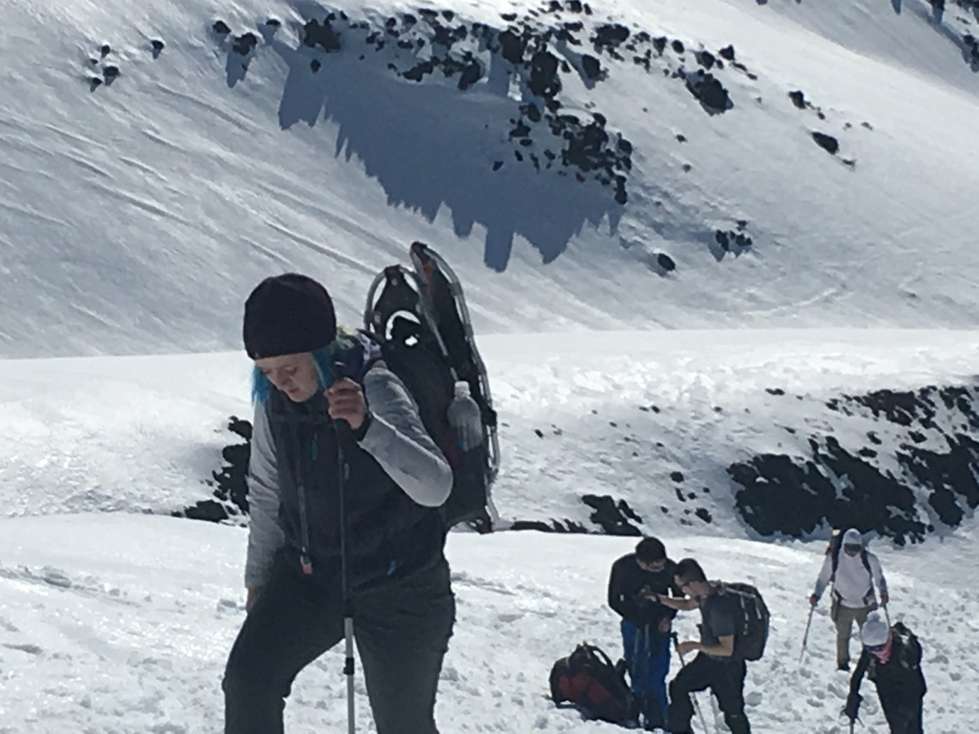 Car camped Saturday night at Marble Mountain and started at around 7:00 Sunday morning. My sister and I brought both spikes and snowshoes. We met a guy the night before who just got down who said in the afternoon sun people were postholing up to their hips and even having trouble floating on top with snowshoes. In the morning we used our spikes up to the tree line with no problems but had to switch to snowshoes after that. The midsection on the rocky ridge was tough and people without snowshoes were postholing deep in 10:30-11am sun. The last couple inclines were steep and we were down to base layers around noon. We summited at 1:00. The way down was brutal- we didn’t bring skis and the heat had melted that middle section snowpack to the point where every step we post holed at least to our knees. My sister almost lost her shoe and was up to her waist many times! We fought through it and switched to snowshoes when it was less steep. Our first accent! It was a beautiful weekend for views and climbing conditions. I would recommend an earlier start to avoid slushy snow.