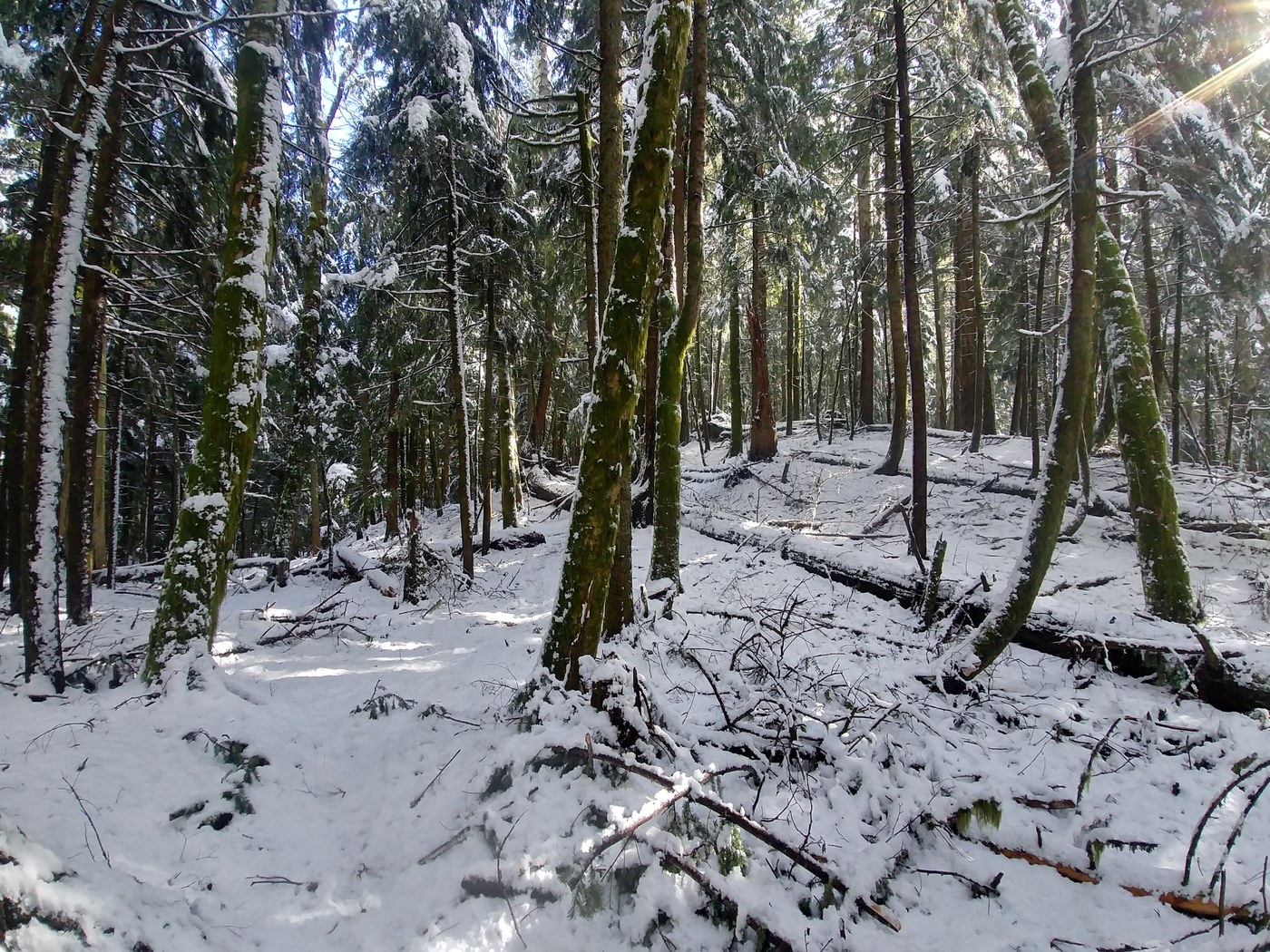- Trail: The trail is in good shape. Trace amounts of snow starting at about 1.0 miles in, the trail remains snow-free until about the 3.0 mile mark. When you leave the forest canopy at 3.5 miles, the snow deepens (6-12 inches, more in some places) for the rest of the trail. Additionally, there is significant amounts of mud throughout the hike (beginning at approximately 0.5 miles) except in places where the snow takes over.