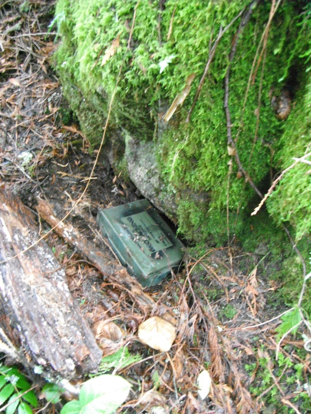 Shortly arriving at the spur end pick a spot and go right into the forest. You can catch a glimpse of the rocky top from here. I traversed up and right to the ridgeline then followed it to the rocky knob. Some may find it challenging but I didn't think it was that bad. Just watch your step and pick your route carefully. Once on top of the high point I spotted the summit register and signed in. Someone else had just been up this month as well. From there go northwest toward a lower portion of the rocks where there's a much more open area with the best views (you can see Seattle on a clear day). Note that it's very mossy and there's a sharp drop off that could prove fatal. After scouting around the area but finding no artifacts I located a geocache and left something behind. I've included the link below so you can decipher the clue and find it too.