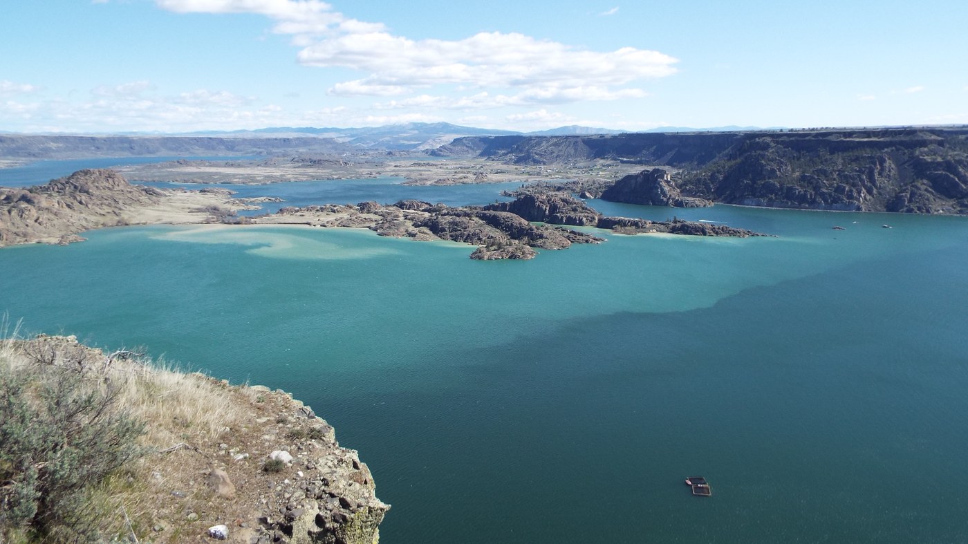 Last time I was in the area I took the Dam Tour (Grand Coulee Dam tour). This time around I was treated to a walkabout on the top of Steamboat Rock. Driving to the state park was no problem, but the wind, always a factor in that area was. A beautiful sunny day, but when at the top, I like everyone else, was always wrapped up. I even had my hat adjusted a couple notches tighter than usual so that it didn't fly off, lost forever! There are four campgrounds where you can pitch a tent, RV, or rent a cabin, although one campground is under renovation this year. And while all trails lead to the same starting spot at the top, you can start the hike up any place you see a trail. It takes a bit of a scramble to clamber or navigate the loose rock, but once you reach an intersection you can go either left or right and circle the top. The views from 800 atop the butte are great, standing in the Grand Coulee. While roaming around the top you can see deer, birds and down below boats enjoying Banks Lake.